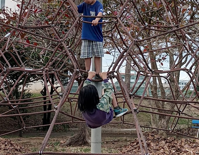 ジャングルジムに 挑戦した 児童が なかなか 降りて こないので 一旦、 降りて来て~