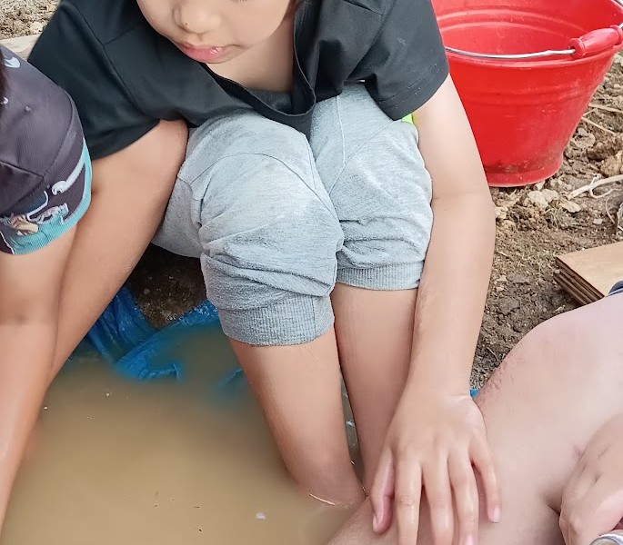 大スコップを 駆使して 穴を 掘り広げるっ(=゚ω゚)ノ 途中、泥と水を 混ぜて 遊ぶことも