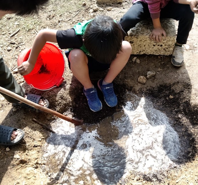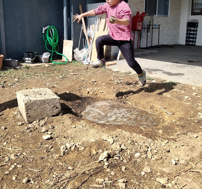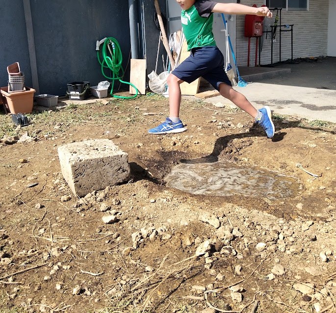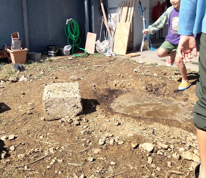 追加っ! その中に 土を ぽい~っ! と 致しまして 泥団子を 作って 地面や 壁に~