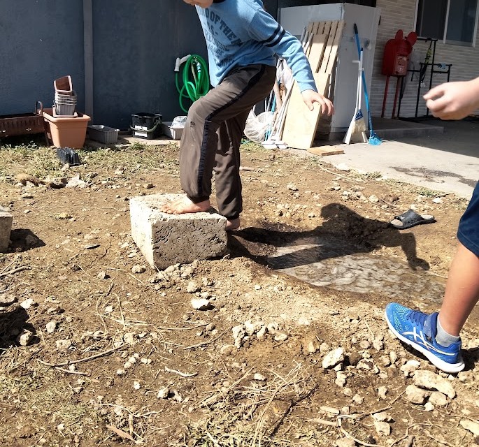 そのあとは その 水たまりを みんなで 飛び越える 遊びに 挑戦。 落ちるか 落ちない