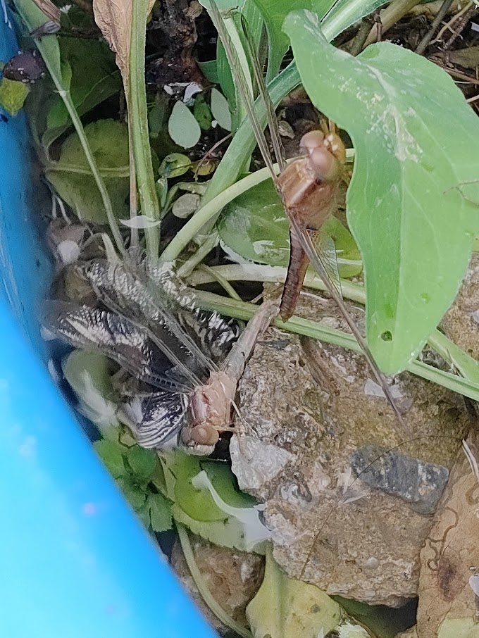 ふと・・・ ビオトープを みてみると (;゚Д゚)!!!!! いまさっきの とんぼの 下の 方に