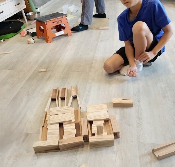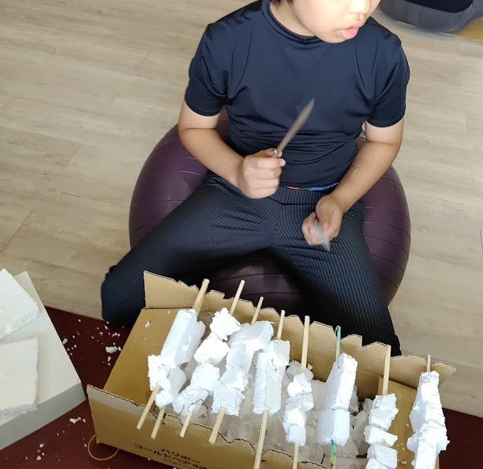 つみきでは 各自の 個性が 爆発っ! ピタゴラ的な 形を 作る 児童も いれば・・・