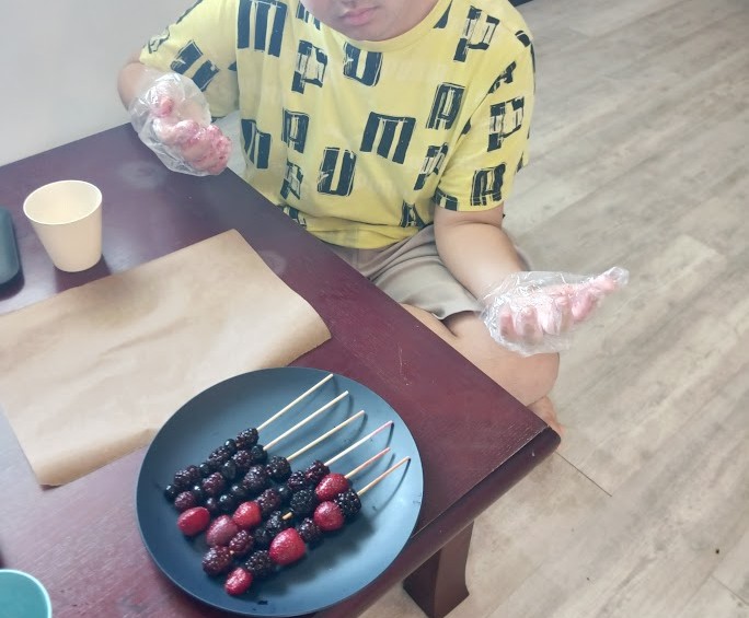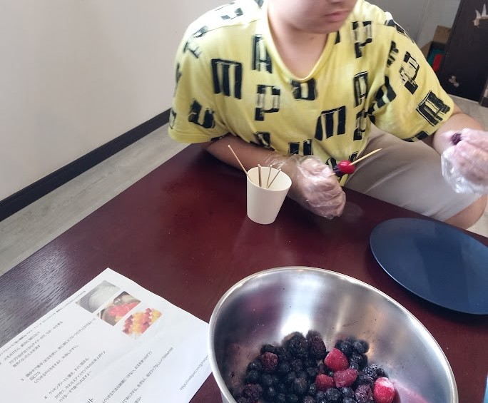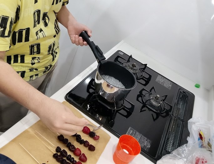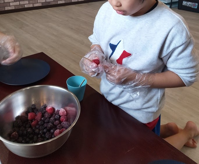 泡だて器で ミックスっ ミックス🌀! の お隣では ミックスベリーを くしに ざくっと