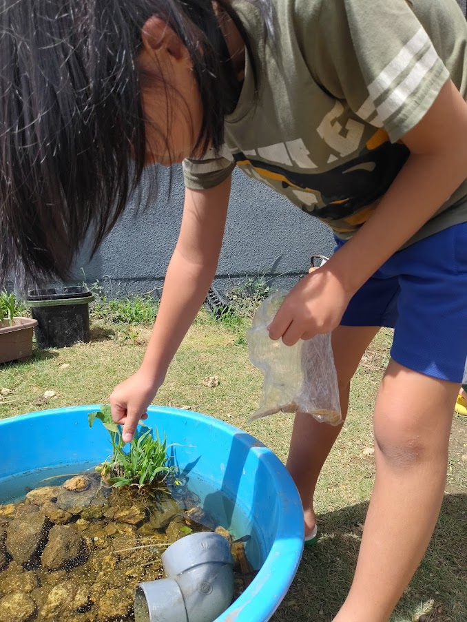 Rくんは ラ・ポールビオトープに いる ヤゴやおたまじゃくし に エサをあげておりんす♪