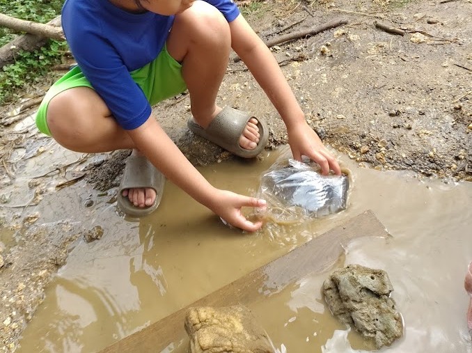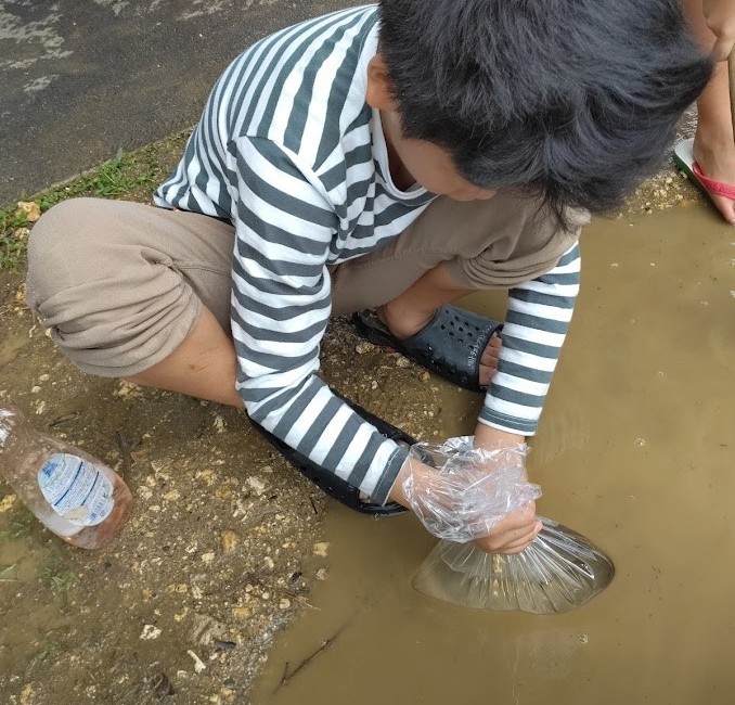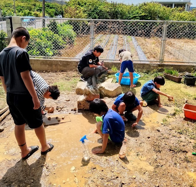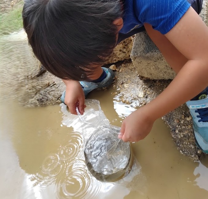 からの~ Kさん。 みんなが ためていた水を すーっと 近づき 虫かごに 入れまして