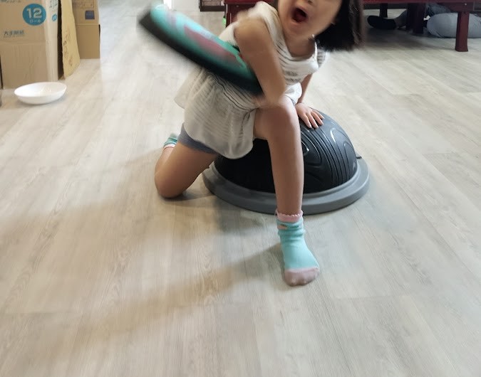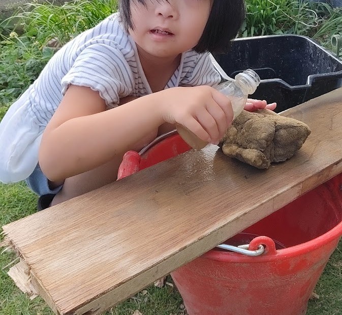 土遊びを 楽しむ Kさんと Kくん。 Kさんは 水を入れた バケツの上に 木の板を 設置。