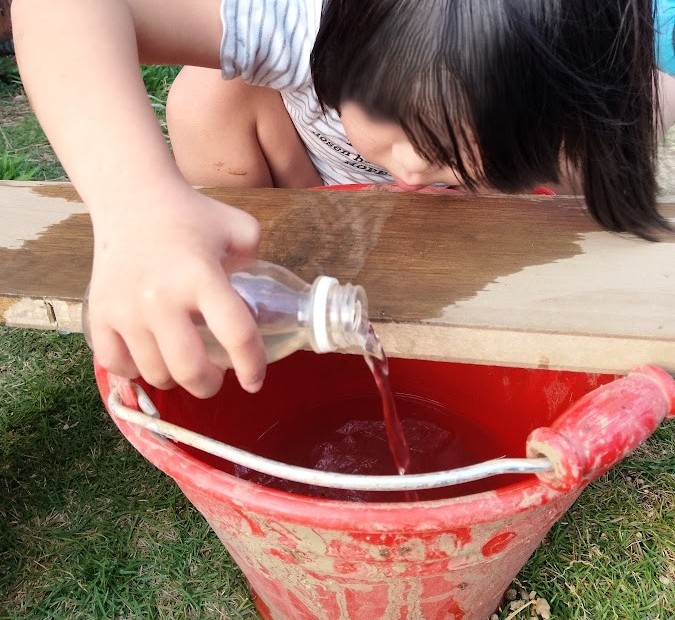 そこに 小ペットボトルを 使って 水を かけ 水が バケツに 入る 様子を 楽しんで