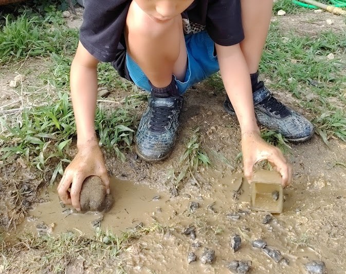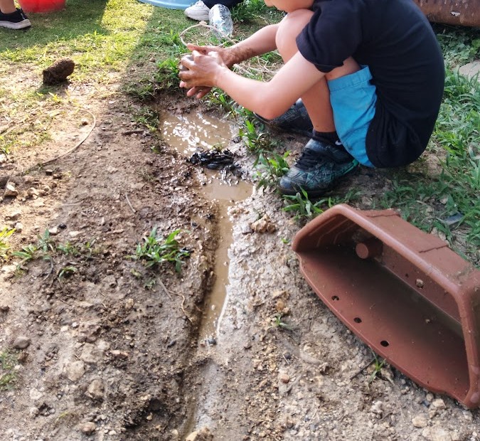 いる Kくんが。 今日も 水と土の 感触を 楽しみ 水の流れを 止めたり 開放したりを