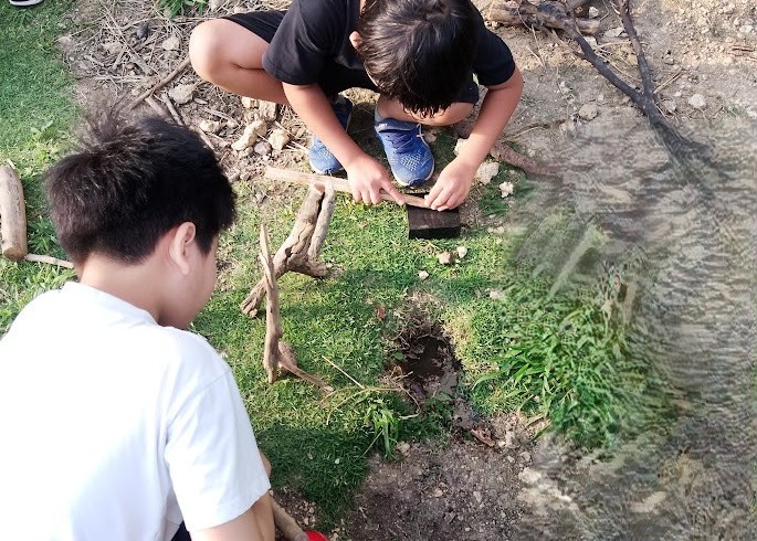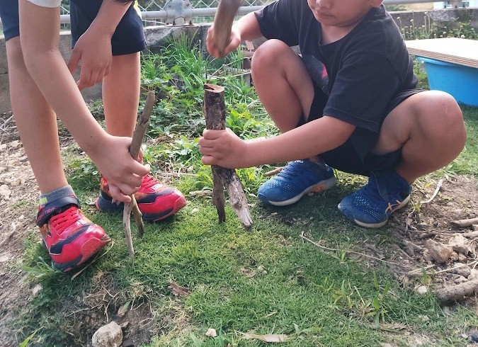 広場へ 向かったのは Oさんと Kさん。 先週末に 見つけた 木を 地面に うめる?
