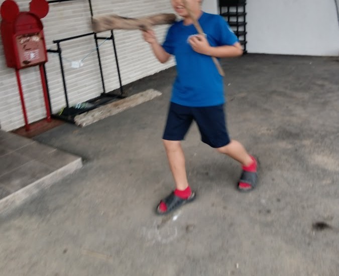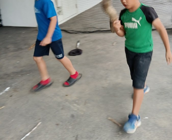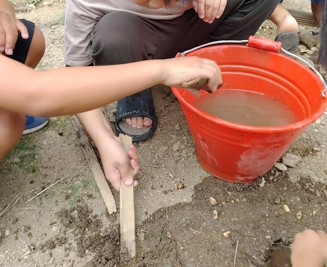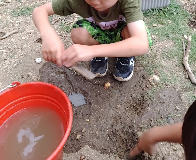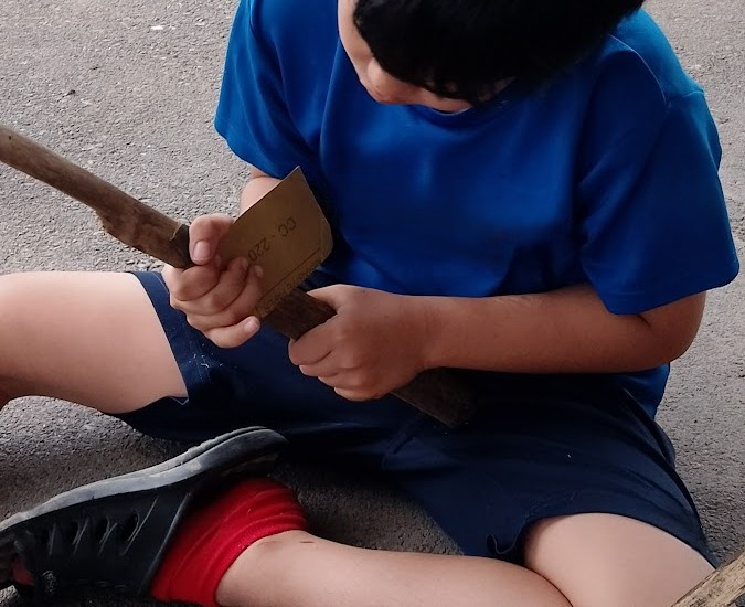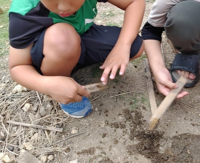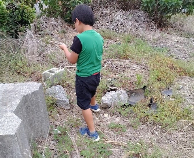 外活動では 木を いい感じの 長さで~ んっ!✊ と 折りまして ざらざらの石や