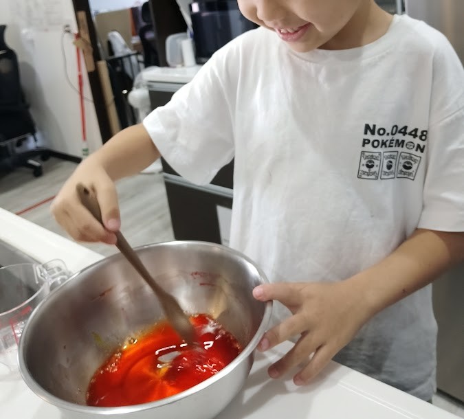 無言で 準備 & まぜまぜ 開始っ! どんな色にするのかな~ と 思って 見ていたんです