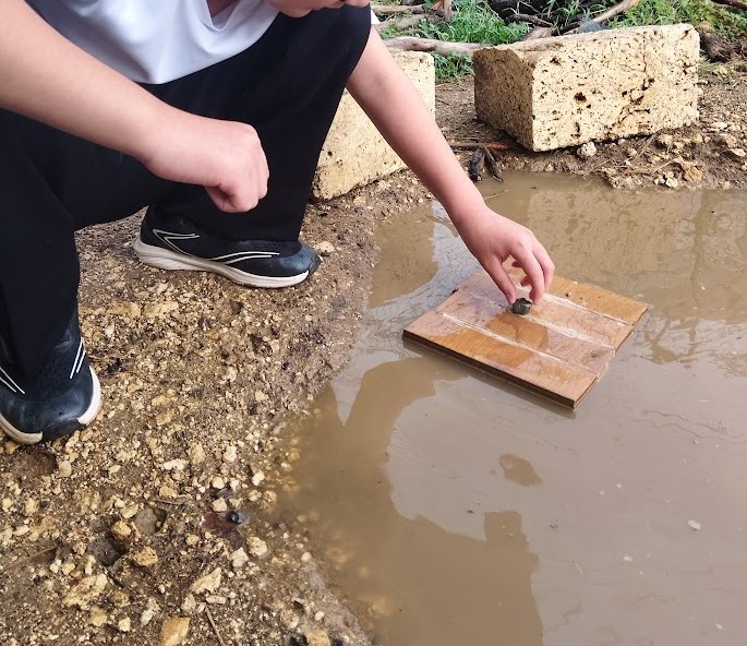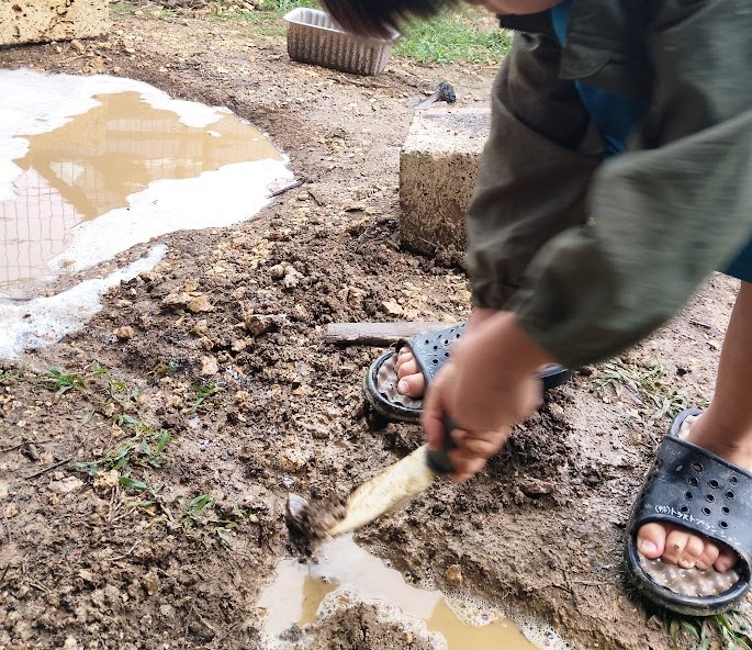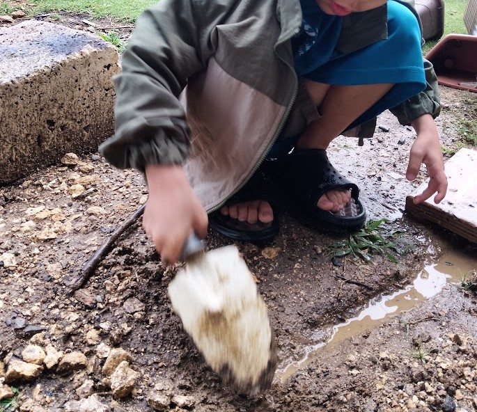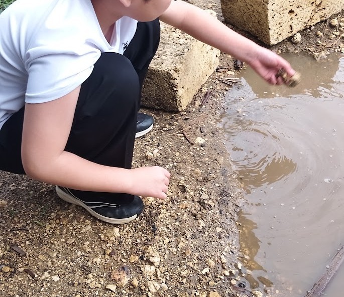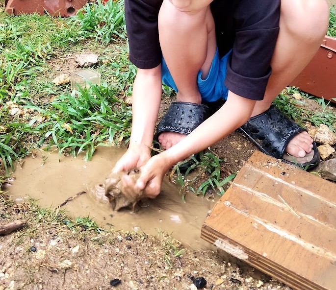 外へ♪ めっちゃ 雨 たまってるぅ(^O^)/♪ さいこー👌 土も いい感じに なってる!
