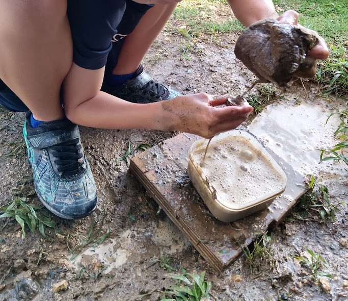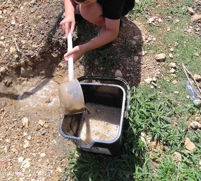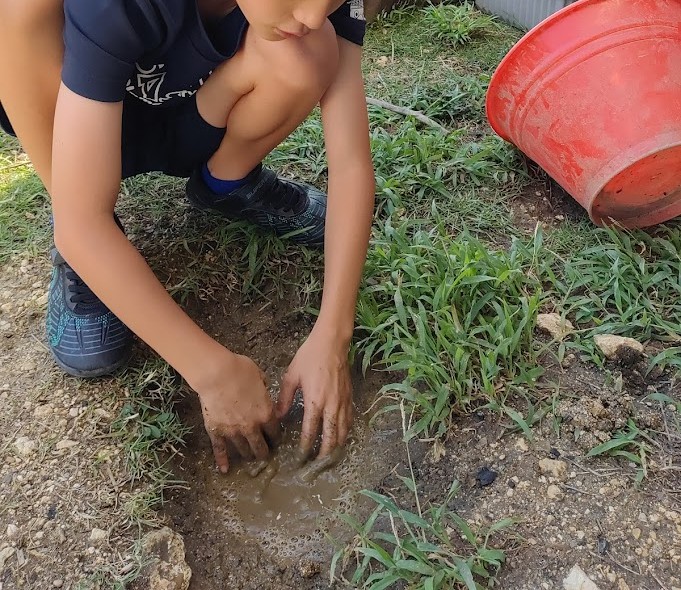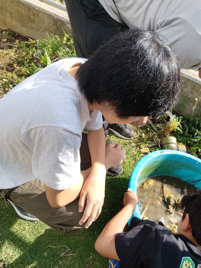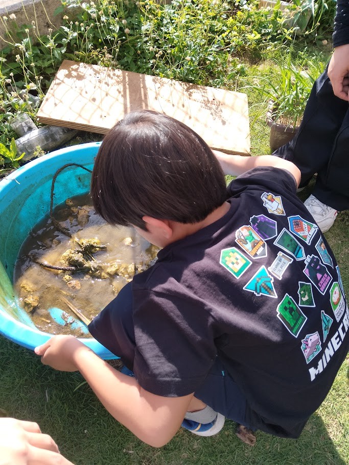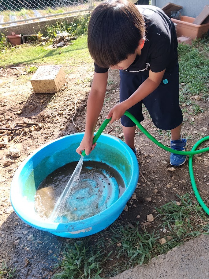 ビオトープの そこの 方は ドロドロの 土が・・・ Kくんが きれいに 洗い流してくれ