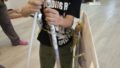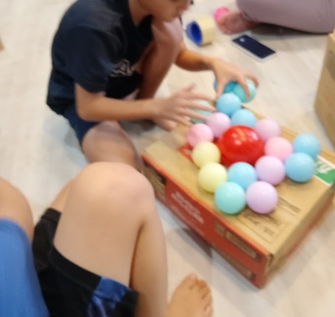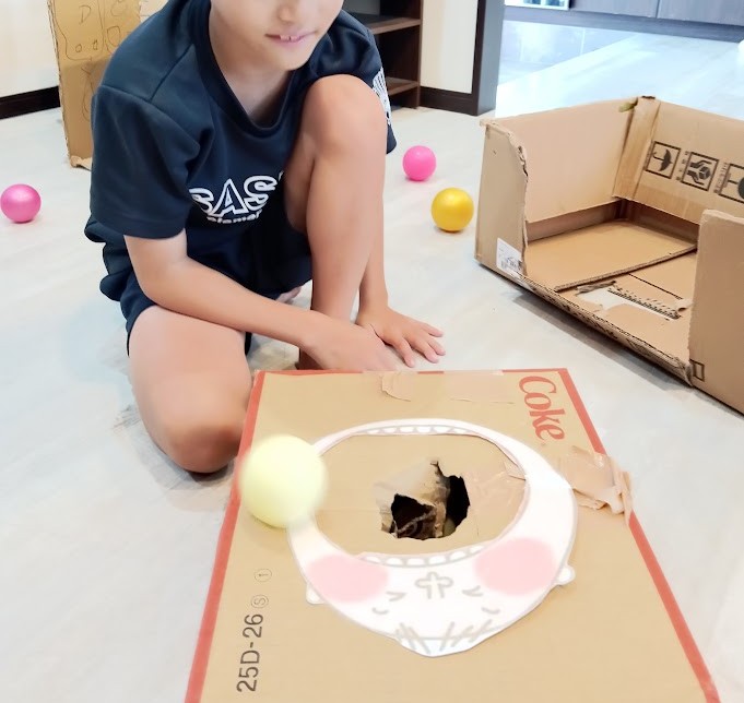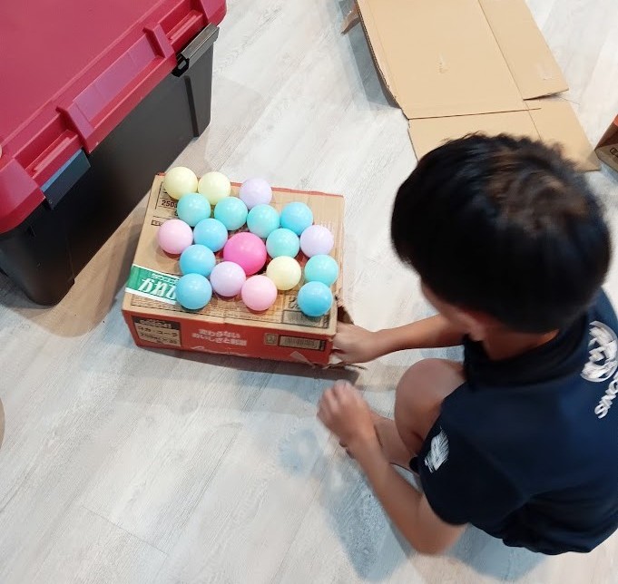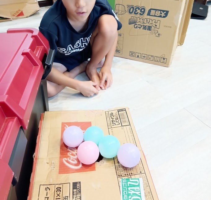 そのころ メインルームでは Kさんが ダンボールの真ん中に 穴を 開けて ボールを