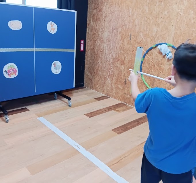 まずは Oさん。 最初は スタッフが使った 弓矢で 的当てゲームを 楽しんでいた