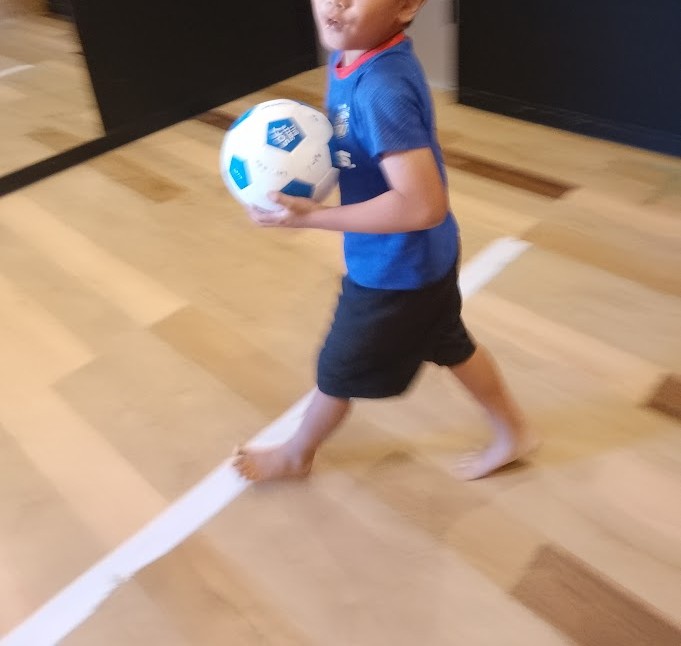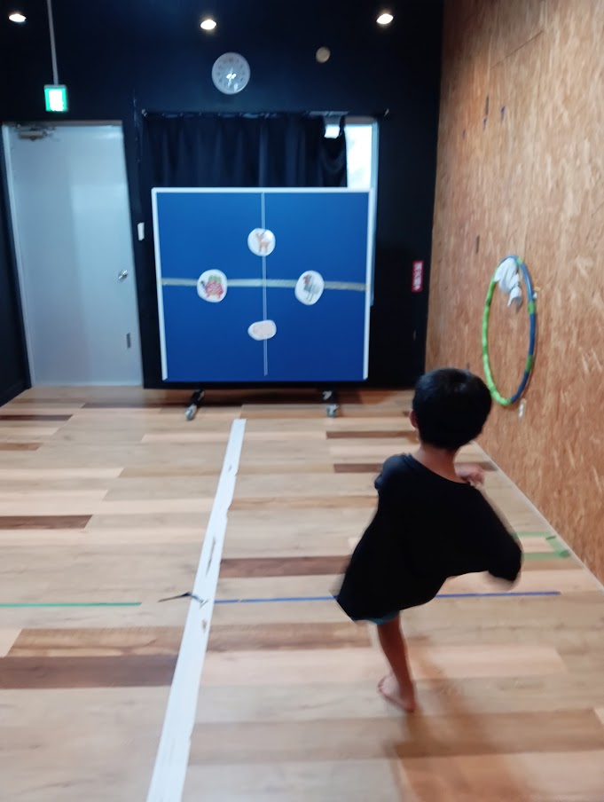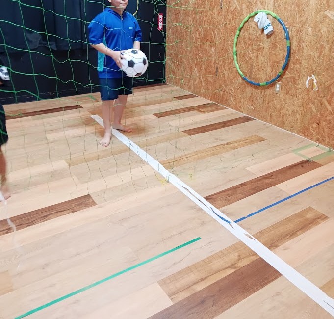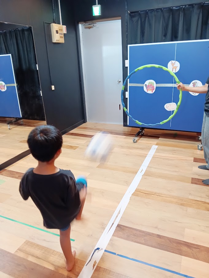 キックして フラフープを 通す練習。 できるようになったあとは 純粋な 的当て