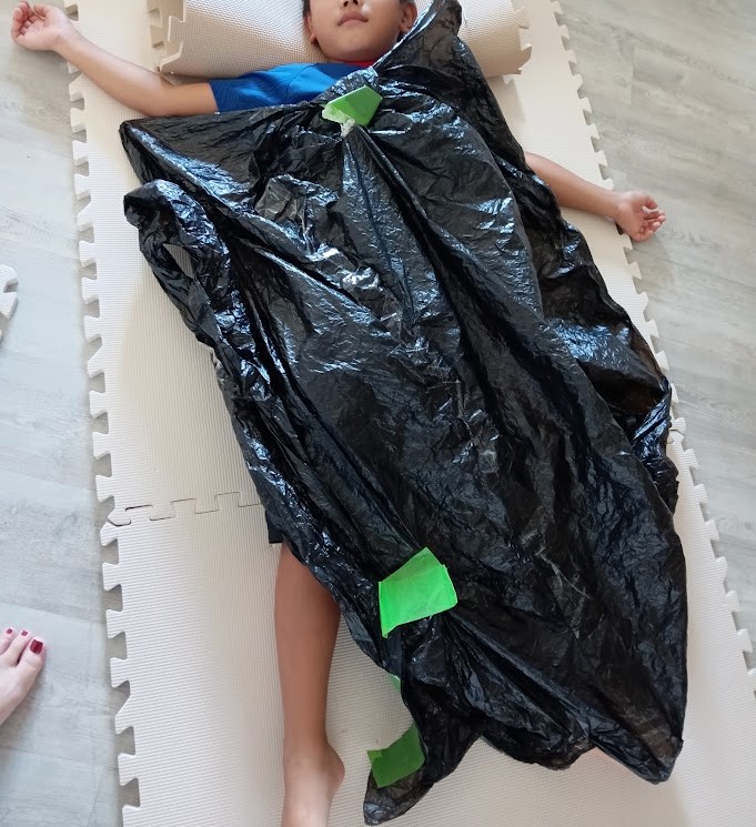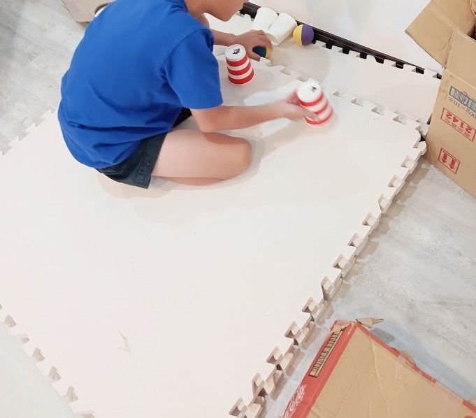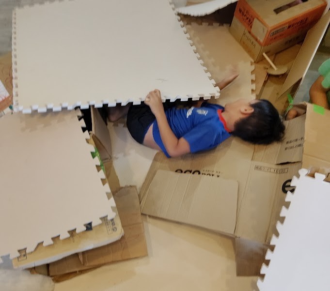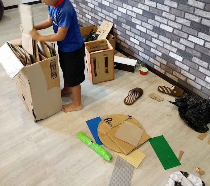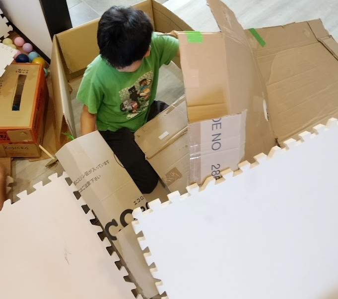 ダンボールと マットを 上手に 組み合わせて 完成させました。 遊んだ後は お片付け
