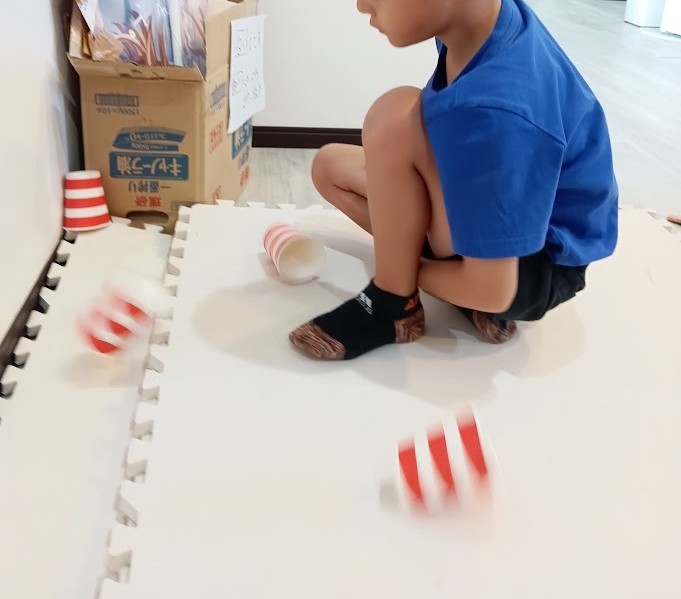 紙コップを 置いて ボールを 転がして~ ボーリング風に遊んだり~ 紙コップを移動