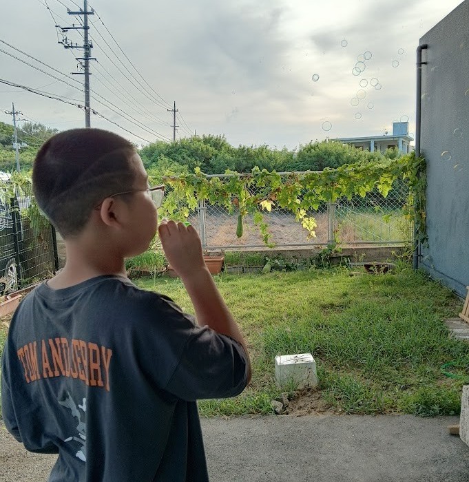 見ながら 飛ばす しゃぼん玉は 夕暮れとへちまフェンスに ばえる~ (^O^)/♪