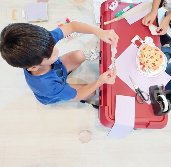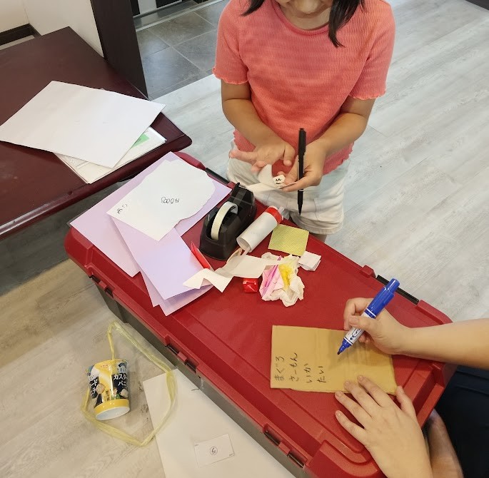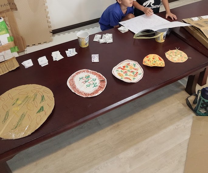 ピザを作ったり お金、商品券、のみもの、メニュー表を作成。 準備が 終わると お客