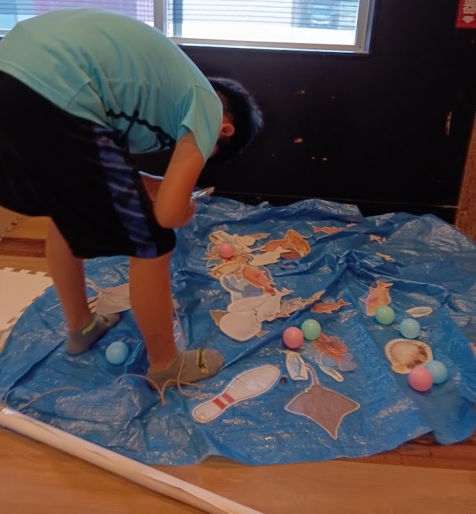 お次は Hさん。 いつものルーティンの本を 読みまして~ からの プールスティック遊び。
