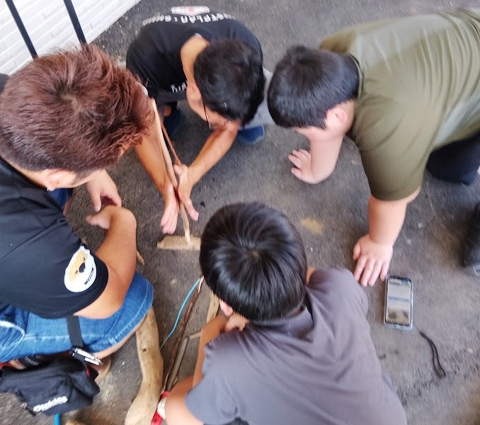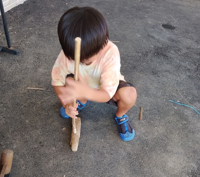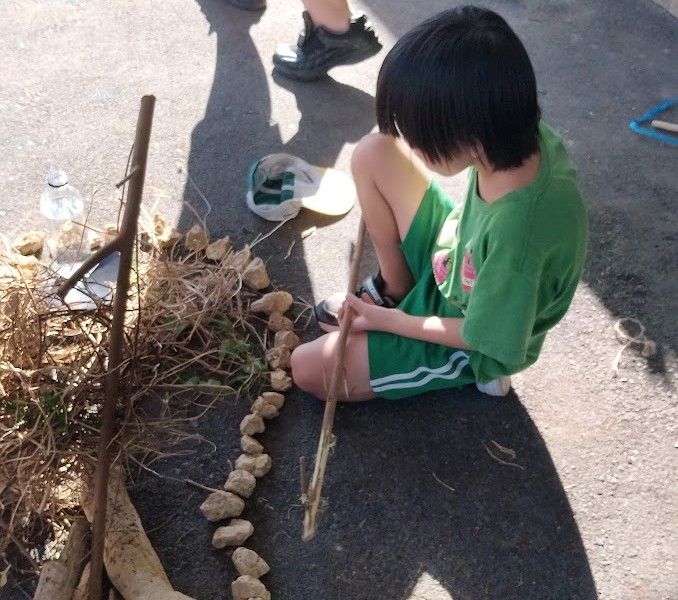 昨日の 続き(火起こし)をする児童 そのほかの 活動をする 児童ともに 一緒に外活動を