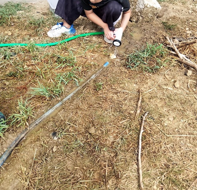 一時、水路を せき止めて~ ホースを 置くと 流れやすくなるんじゃない? いいね~