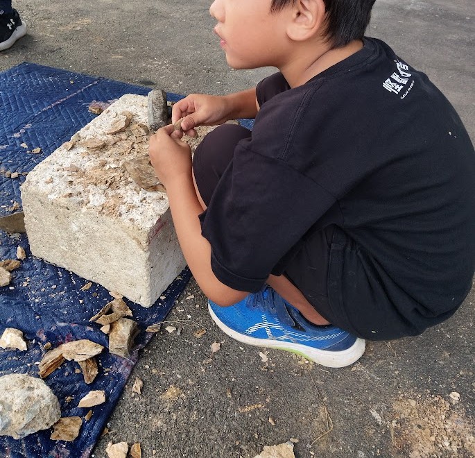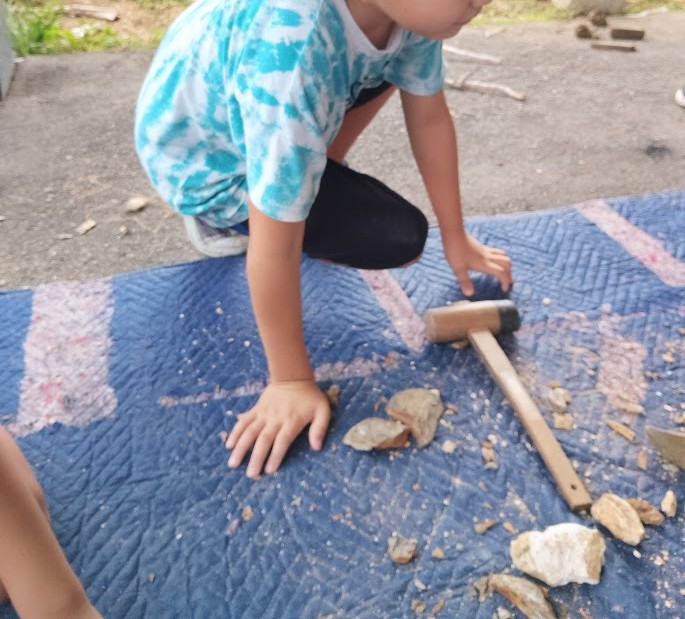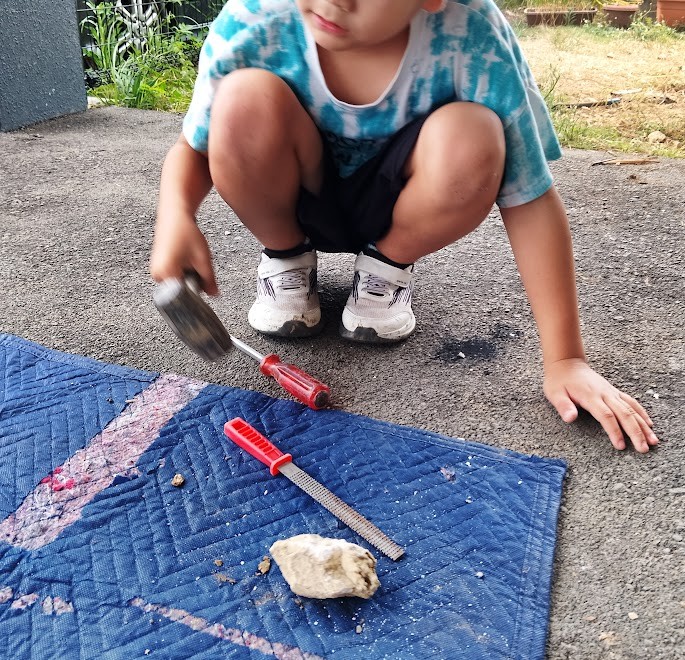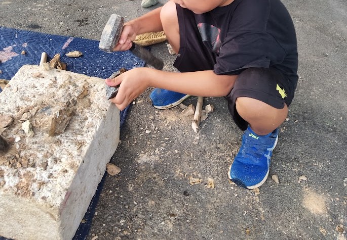 お片付け~。 使った、道具を 元の場所に 戻して~ 飛び散った 石の破片は