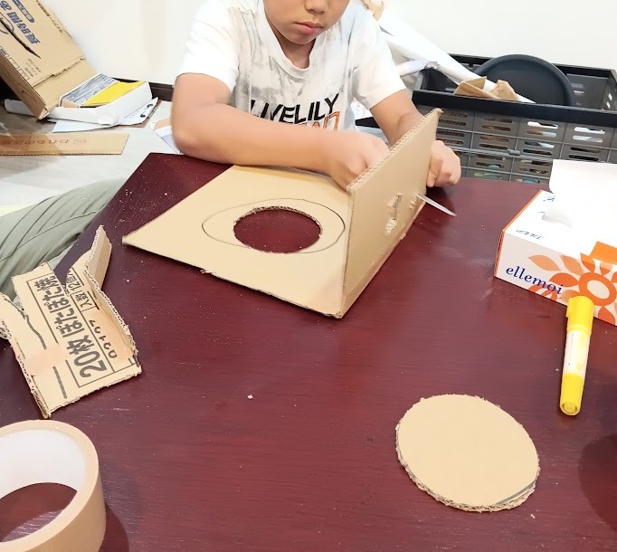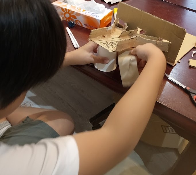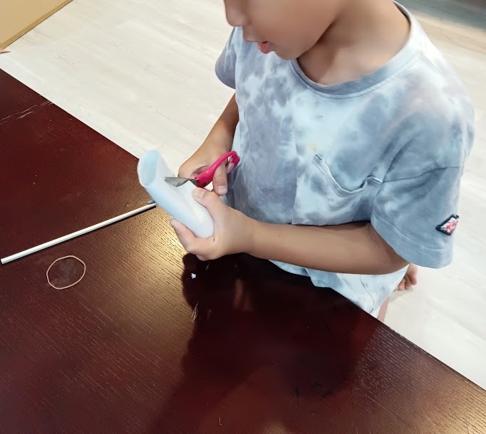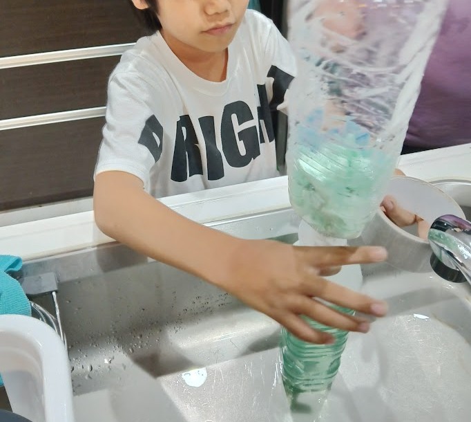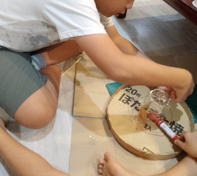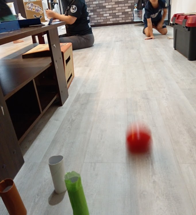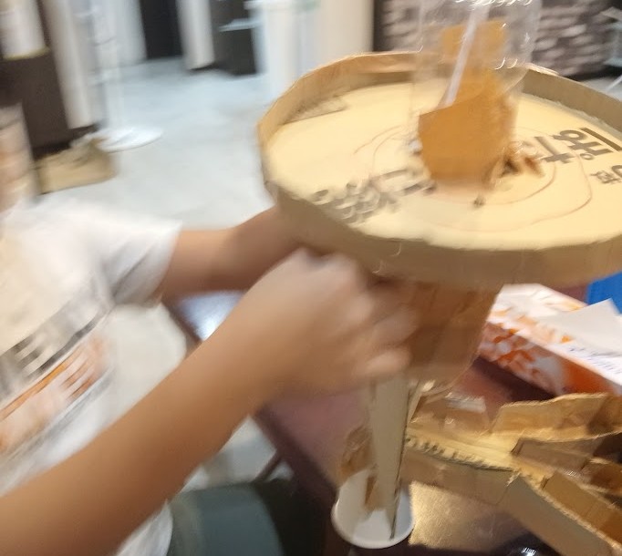 ピタゴラ工作してました~♪ 上の皿からペットボトルを通って下の仕掛けに ビー玉が