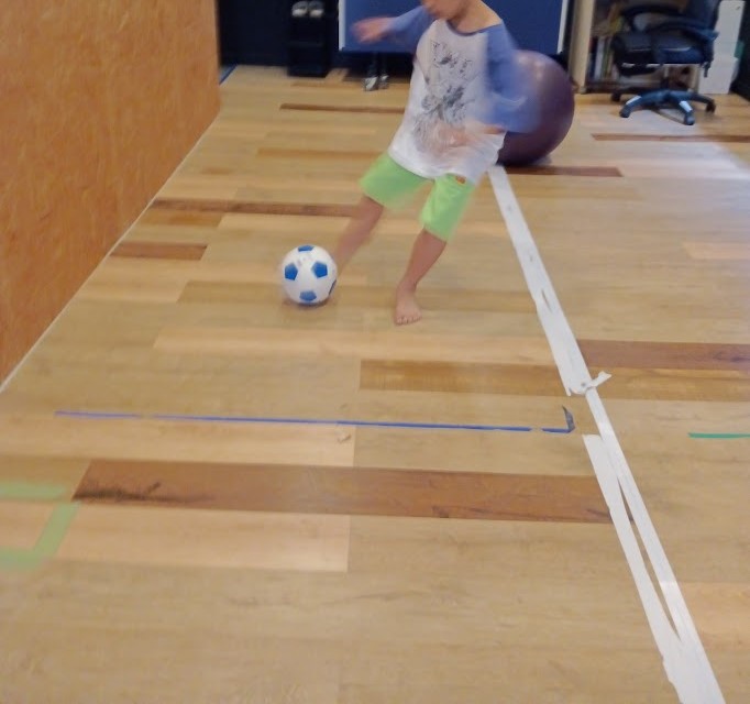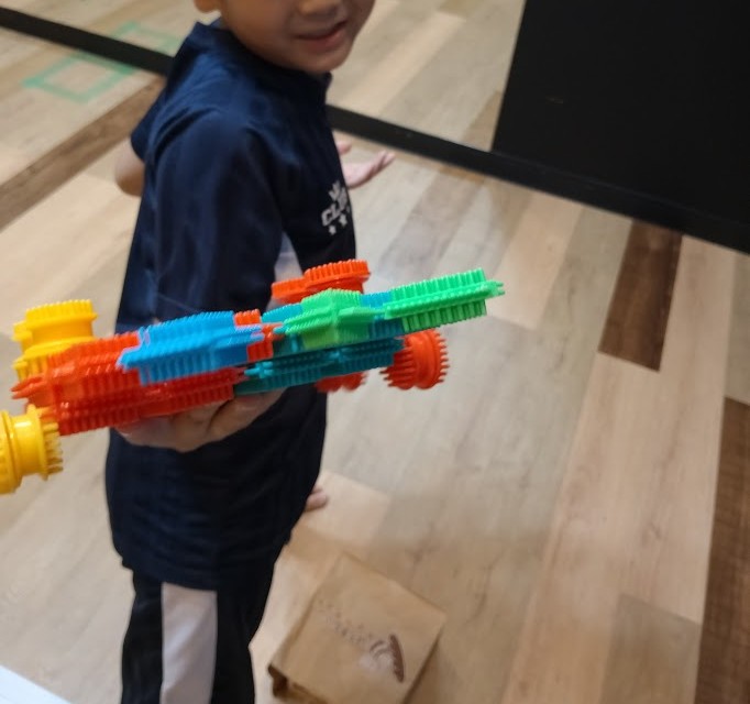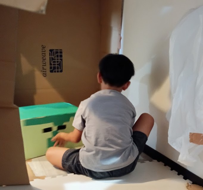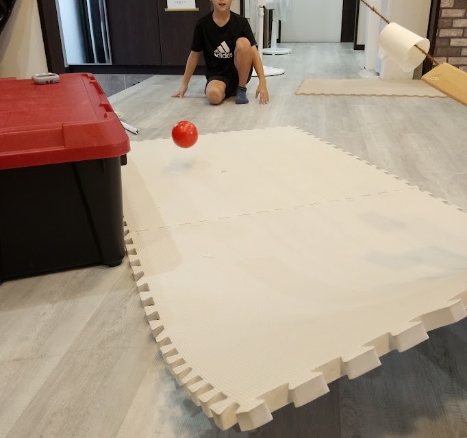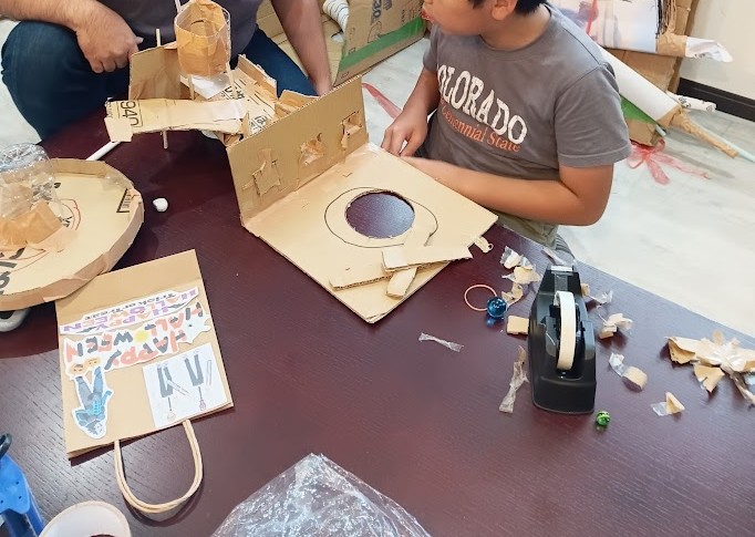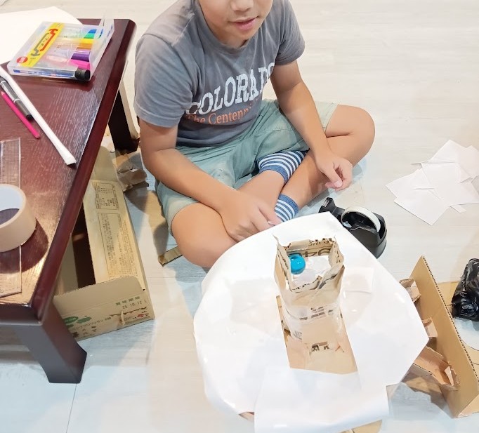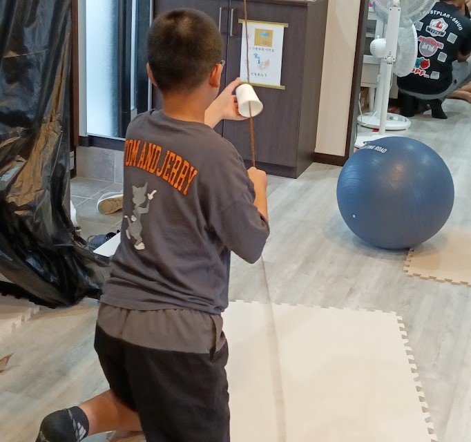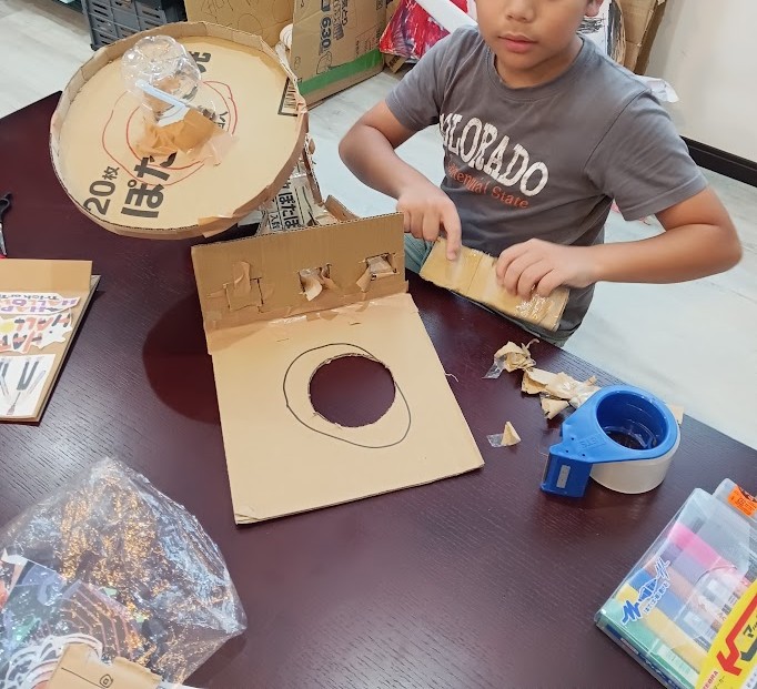 Rくん。 昨日、とりかかった ピタゴラ工作(びー玉コロコロ)の 続きを 行いました♪