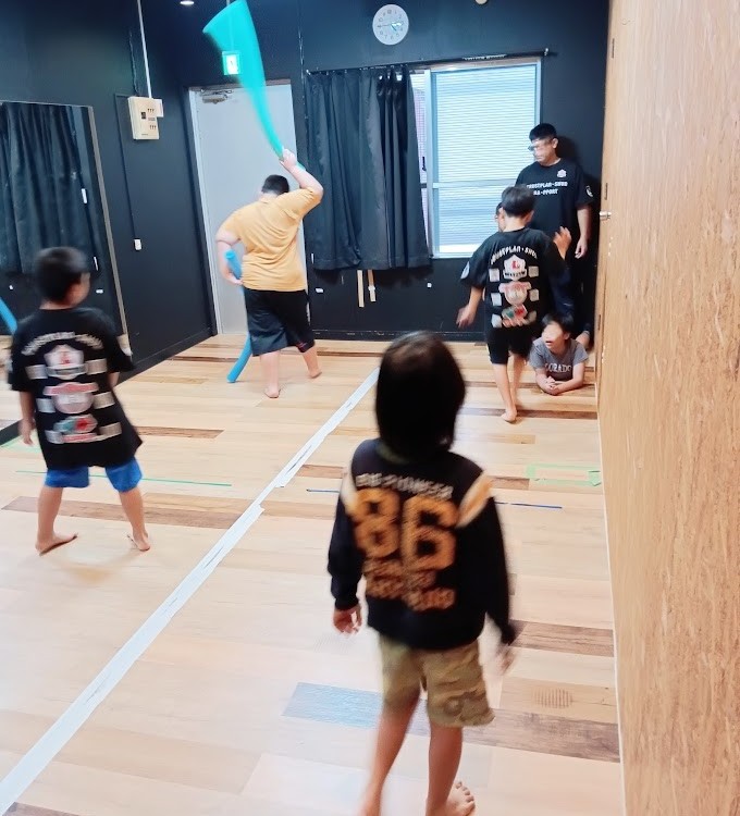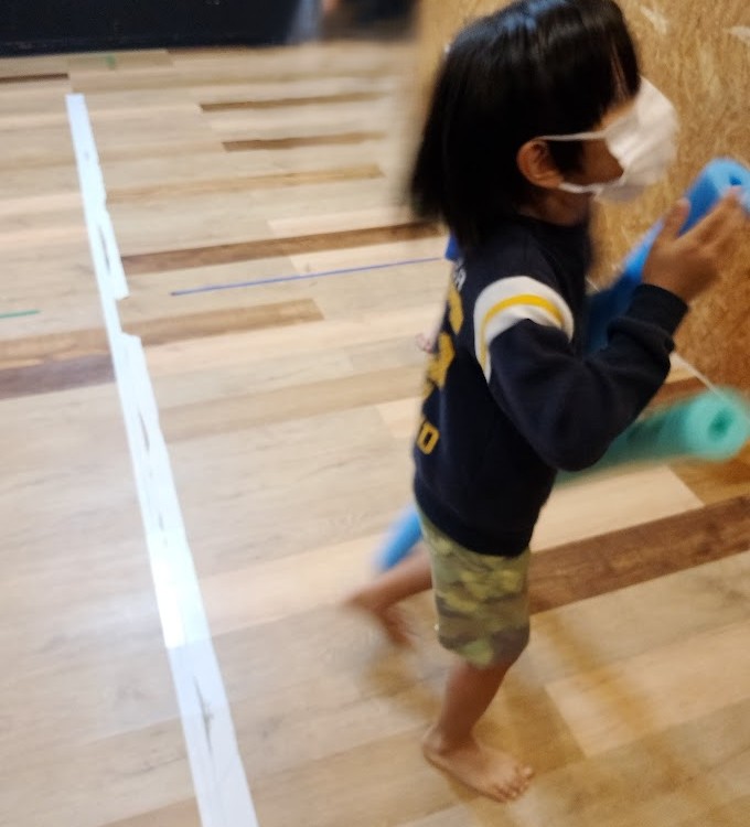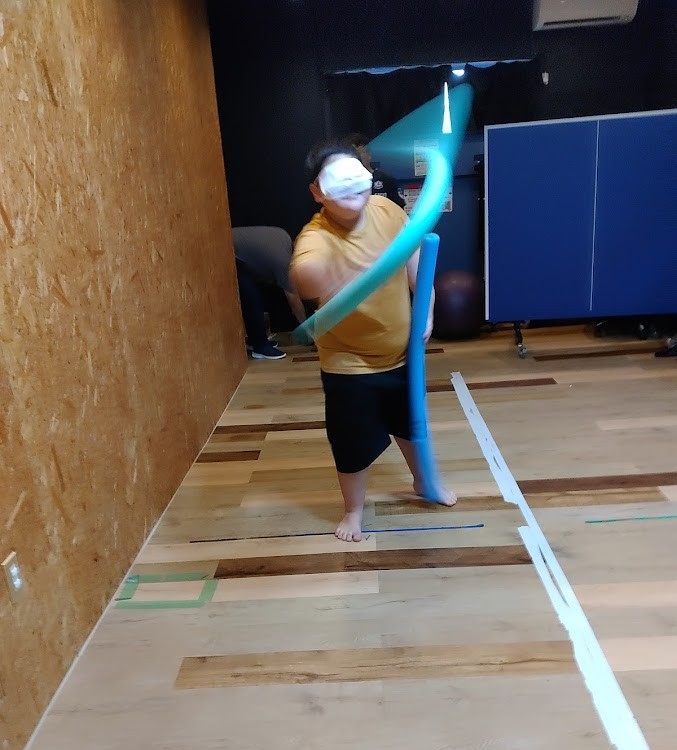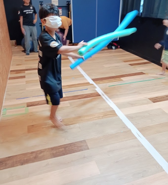 おには目隠しをして10回、 回ったあとに プールスティック片手に 逃げる 他児童を