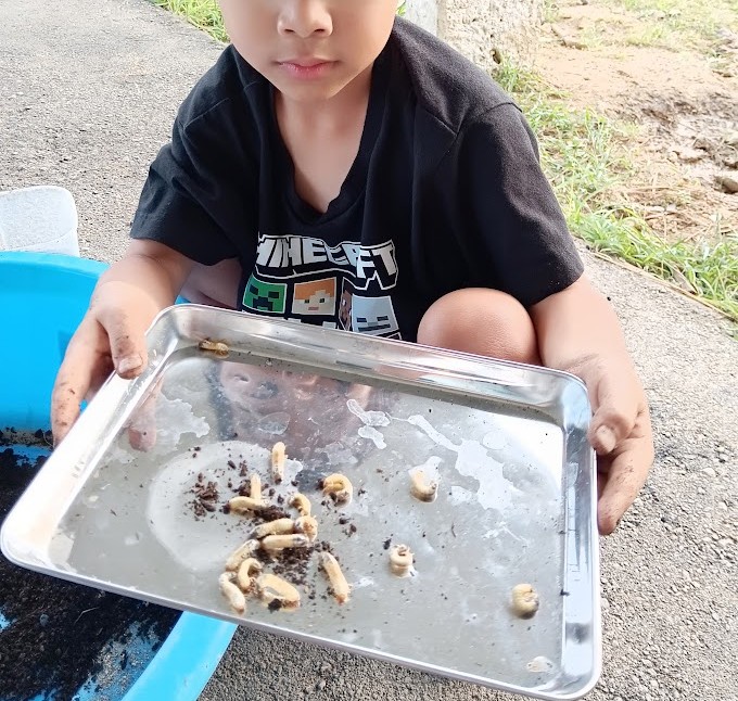 なんか いるっ! がしがし 掘ってみると~ カブト?カナブン?の 幼虫らしきものが・・・