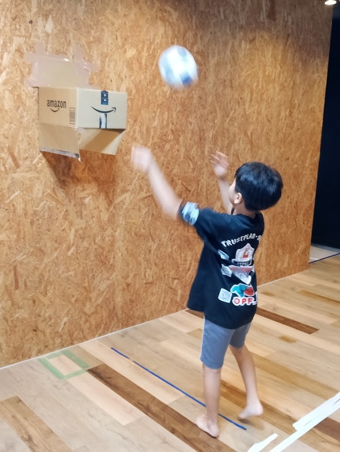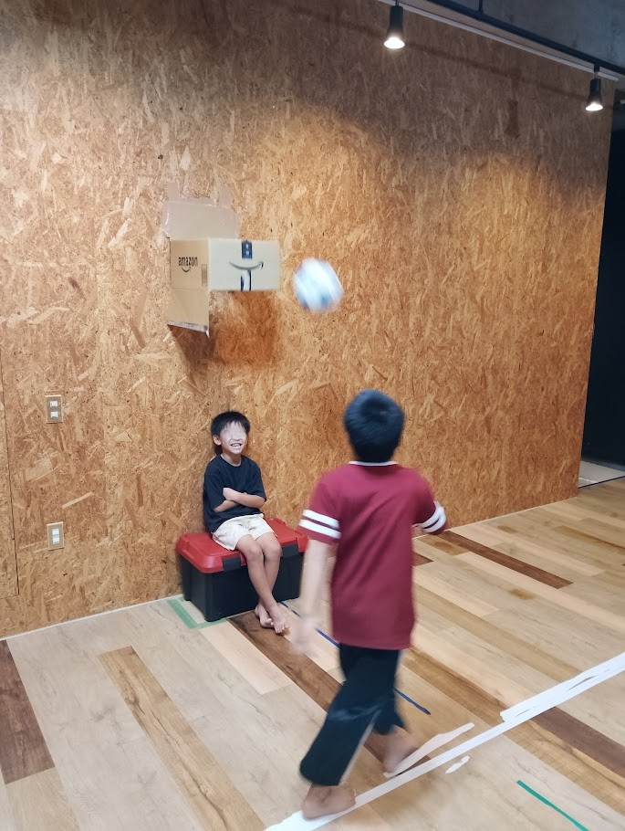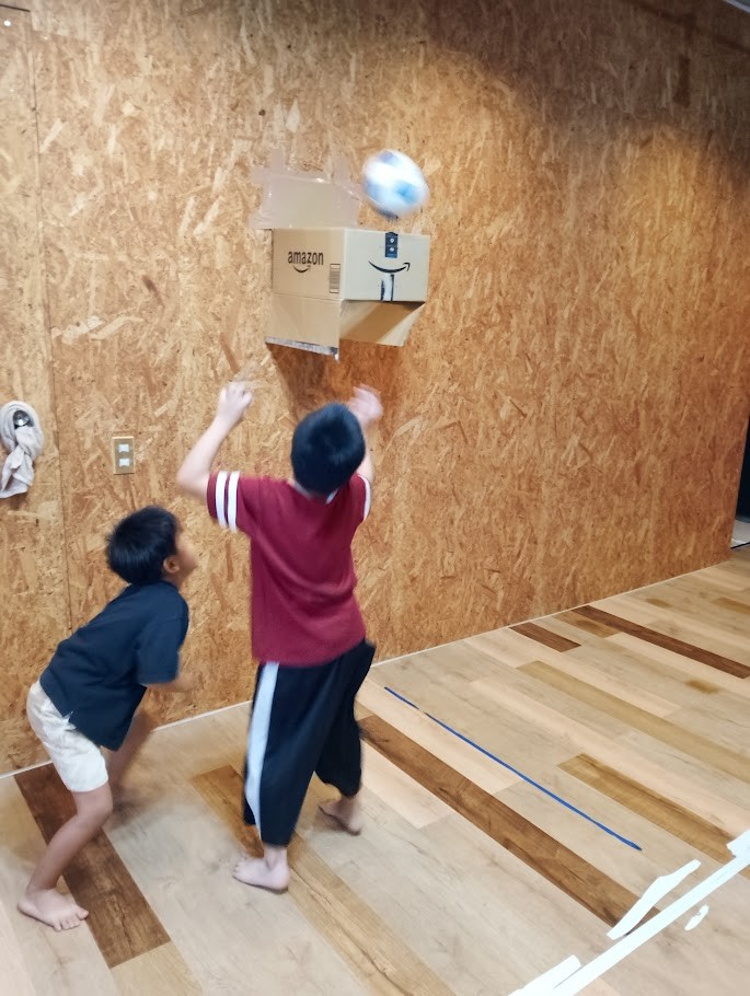 ダンボールを 貼り付けて バスケットボール風の 遊びを AさんとSさんが 楽しんで
