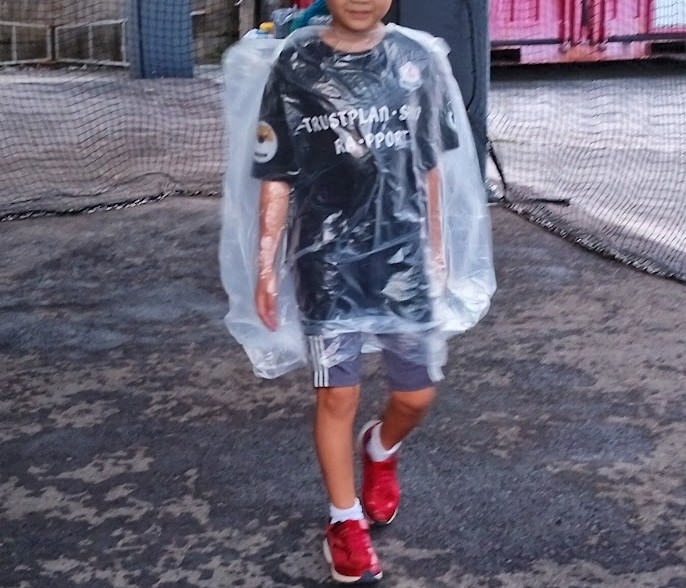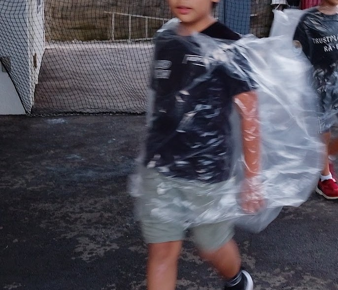 カッパがある人は カッパ着て ない人は ビニール袋を 加工して着て ボス?的存在の