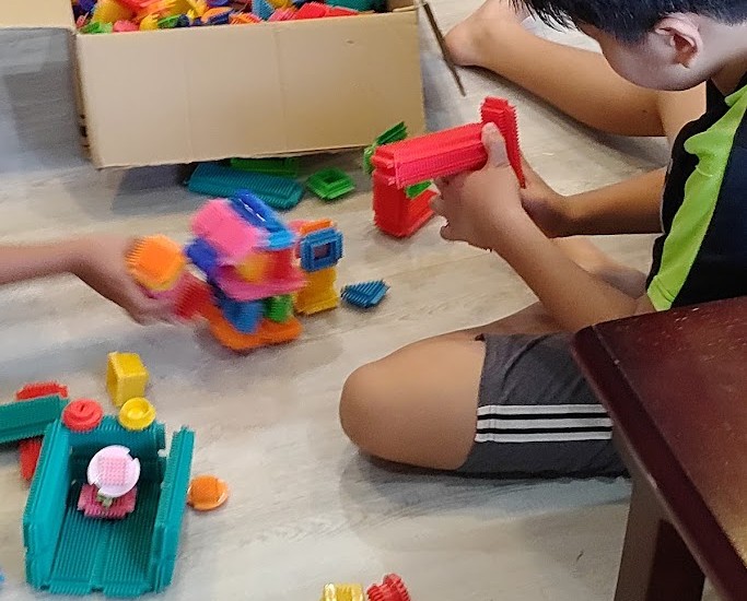 そのころ メインルームでは 2人で ぺたぺたブロック~♪ 基地的な ものを 作って