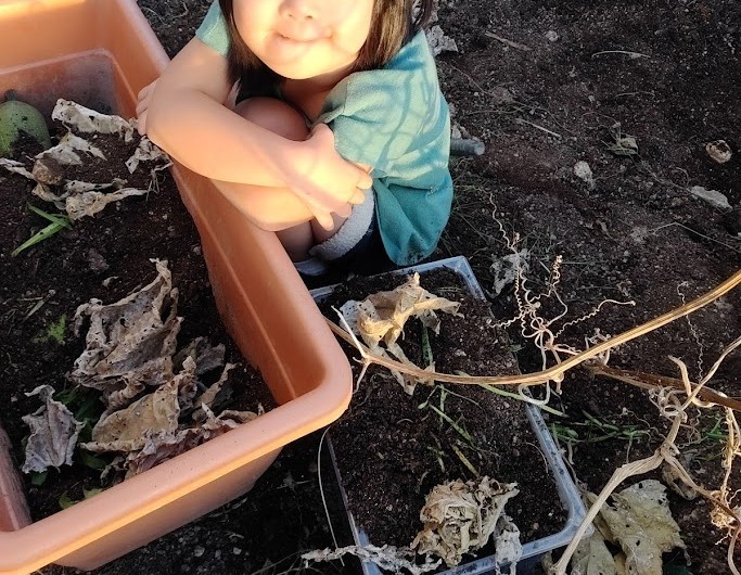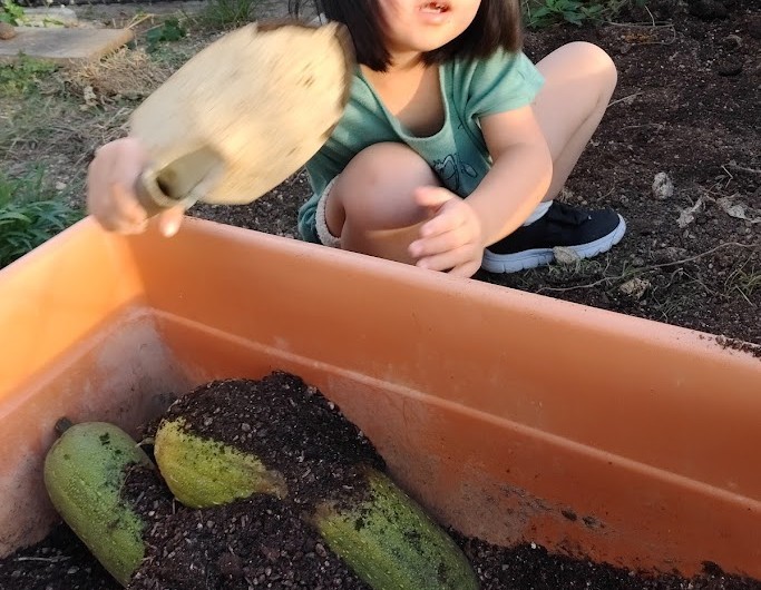 それは イヤだったようで・・・ そのまま 生のへちまを プランターへ 投入して 土を