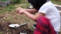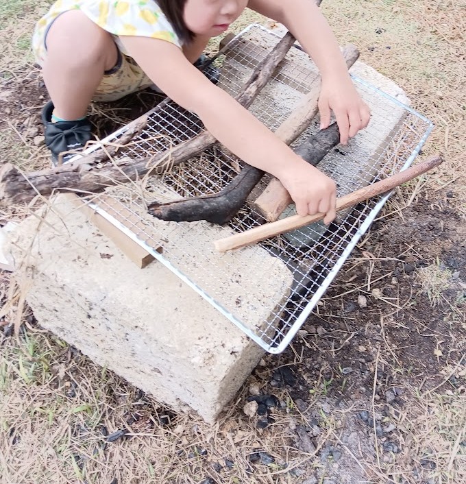 た べ・・・ ろ と・・・? その後は そのあみを 簡易かまど?的な 感じに 作り