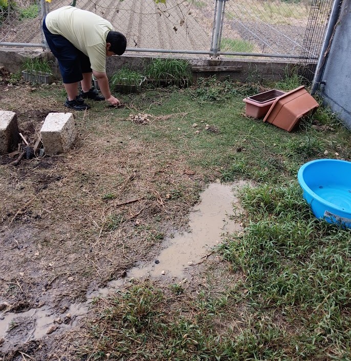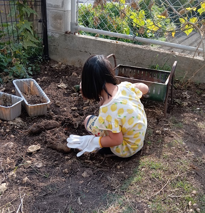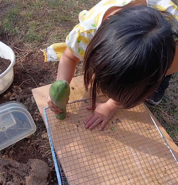土遊びの 第一人者?の Kさんは 今日も 土を ほりほりして へちまを ぼき~っ!