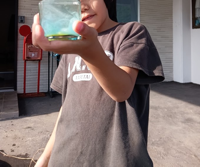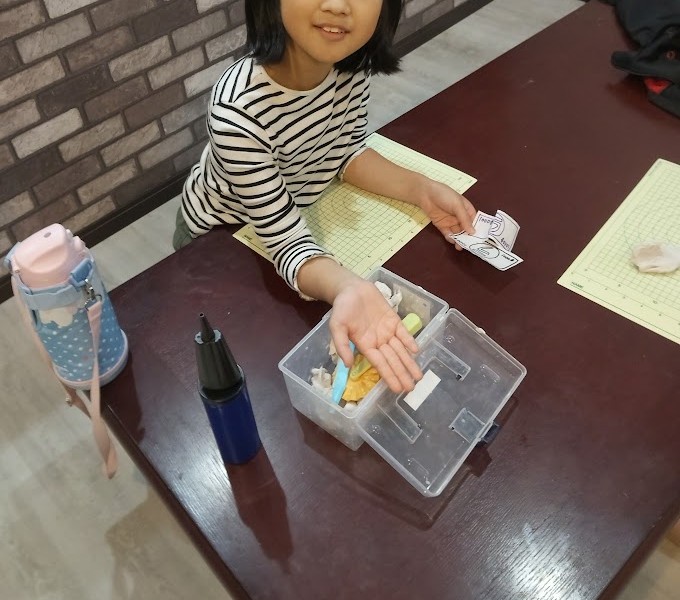 その横では SさんとRさんが 作ったスライムを ビンにつめ ちょいと 水を 入れて~