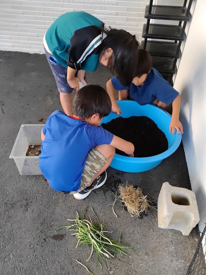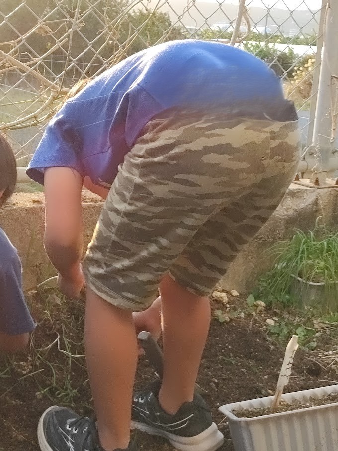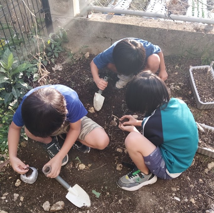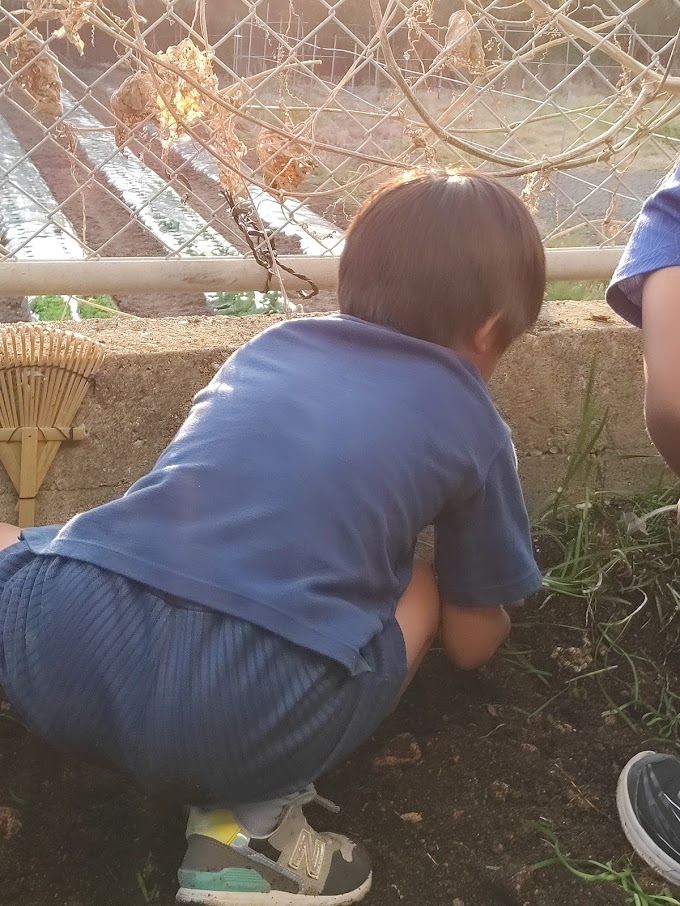 の 近くでは なにやら 土いじりに 夢中の 児童が 3名 おりやして~ なにしてるのかな