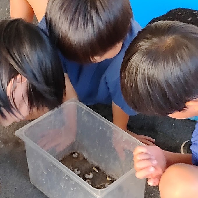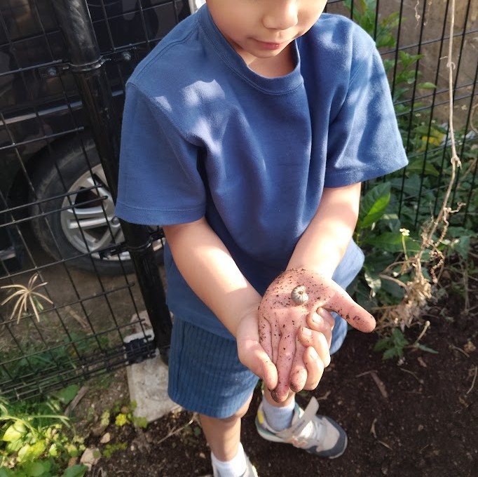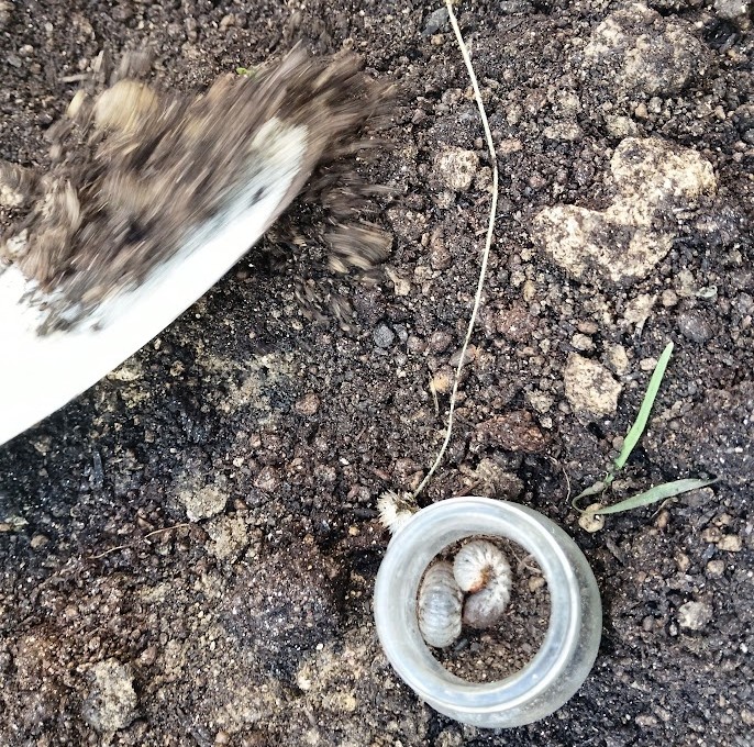 これっ👉 と みせてくれたのは・・・ カブト? カナブン? の 幼虫らしき 地むしさんが