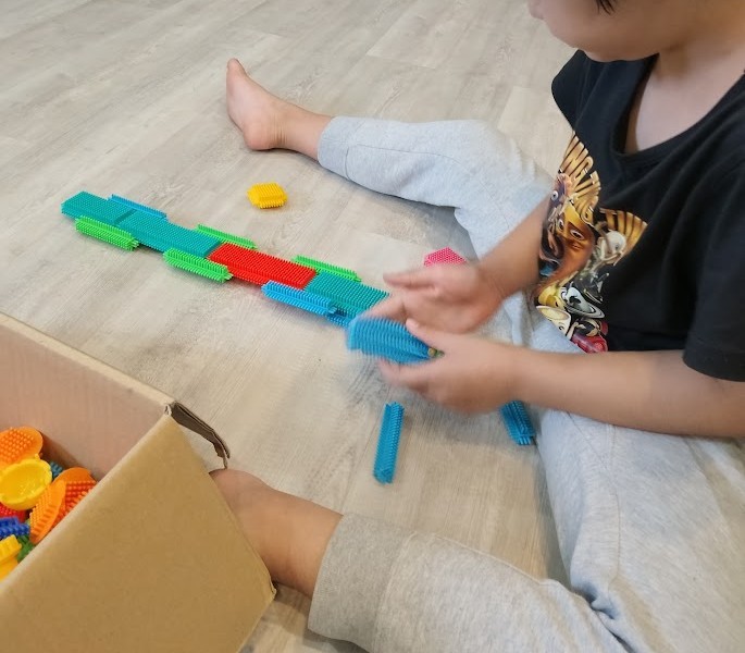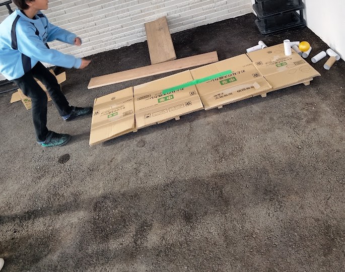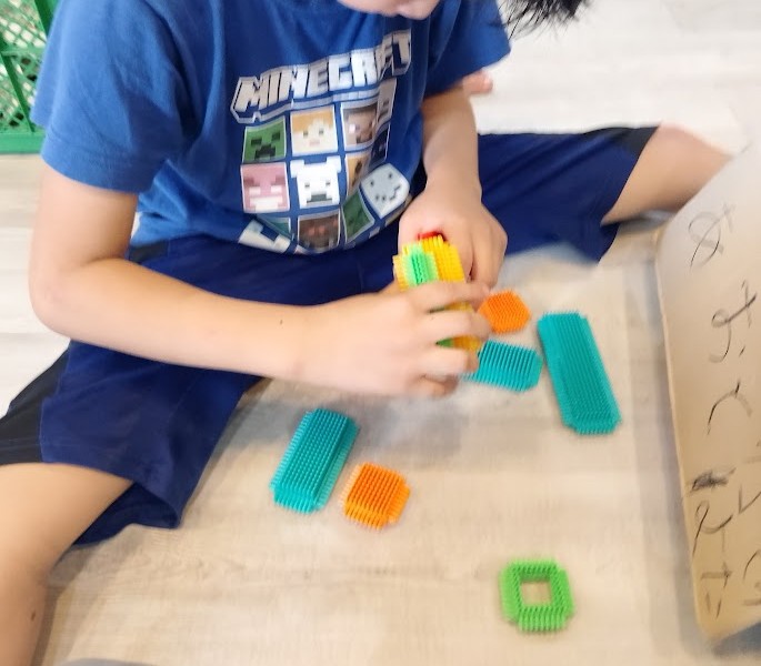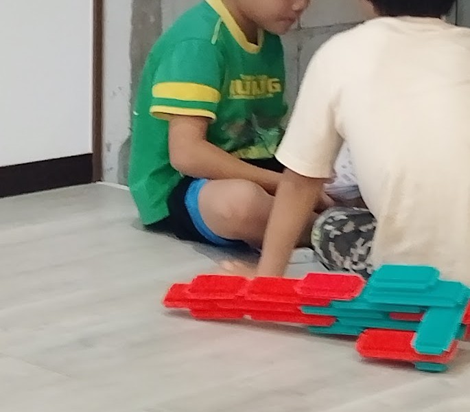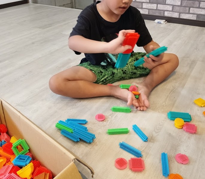 その後、 帰還した 児童と 一緒に 今度は ぺたぺたブロックを 開始っ! 武器を 作る