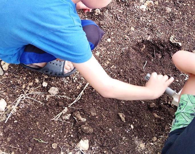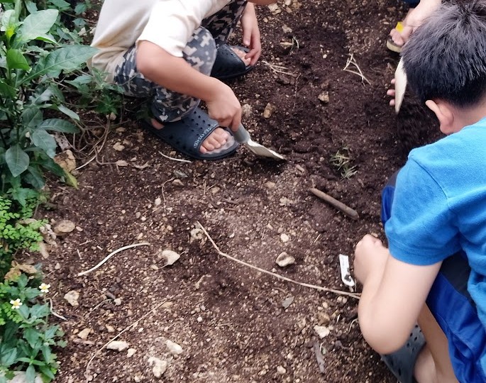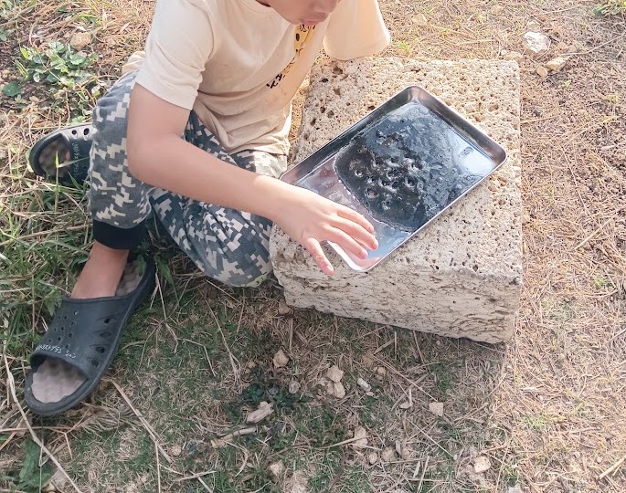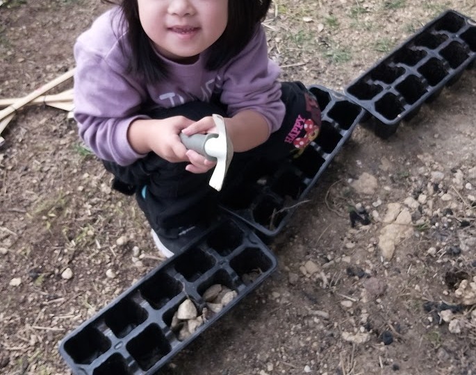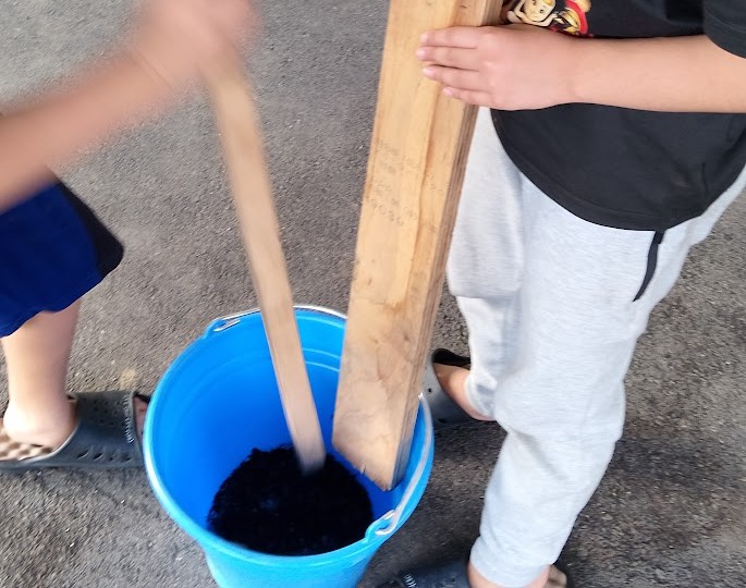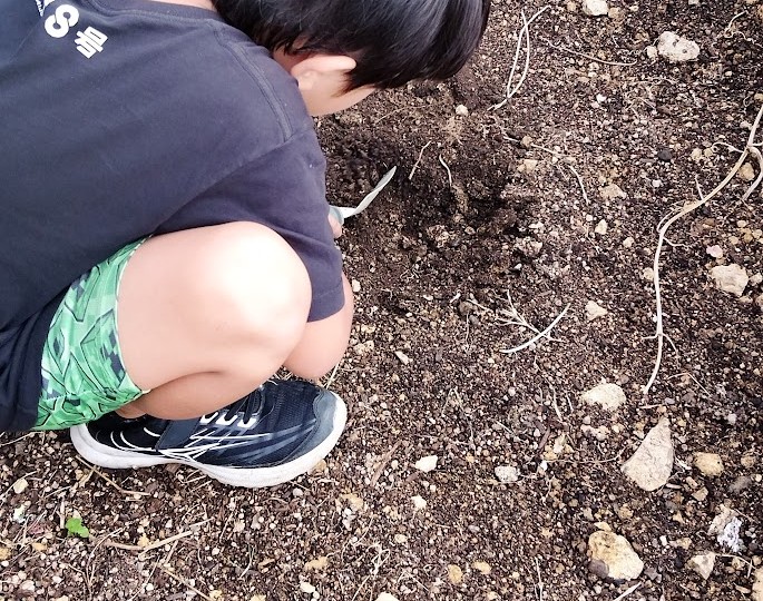 と お話しすると 即、 行動っ! 外で 土をいじったり 金曜日に 出来た 炭を 細かく