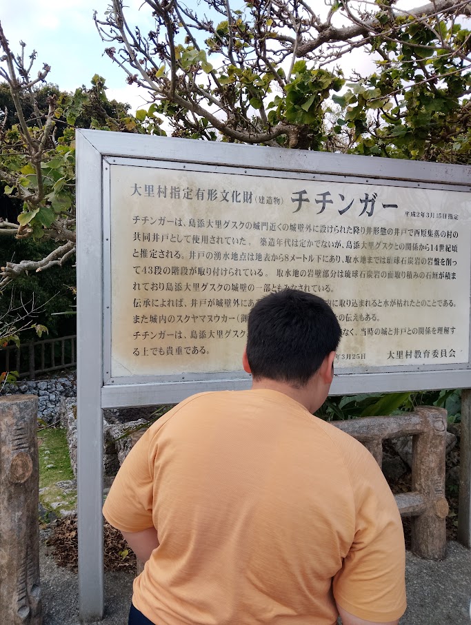 島添大里城の城門近く、城壁外に儲けられた「降り井戸」と呼ばれるタイプの井戸で、西原集落の共同井戸として使用されていました。井戸の湧き水地点は地表から8メートルほど下にあり、取水地までは琉球石灰岩の岩盤を削った43段の階段が取り付けられている。取水地の岩壁部分は琉球石灰岩の石垣が積まれ、島添大里城の城壁の一部とみなされている。言い伝えによれば井戸を場内に取り込むと水が涸れ、城壁外に出すと再び水が湧き出たことから、城壁で包めない井戸「チチマランカー」と呼ばれ、それが「チチンガー」になったと言われている。(らしいね南城市より転載)