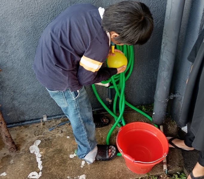 (≧◇≦)♪ 他の 児童も テンション↺↺↺ で 水鉄砲、 水ふうせん を かけあい、 投げ