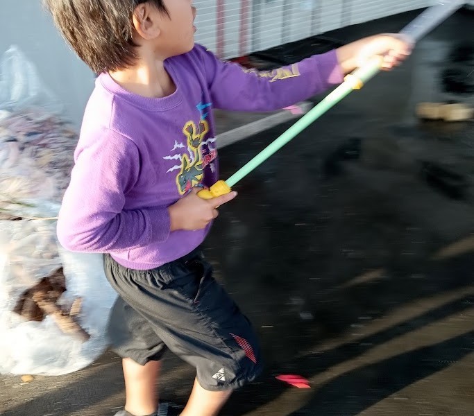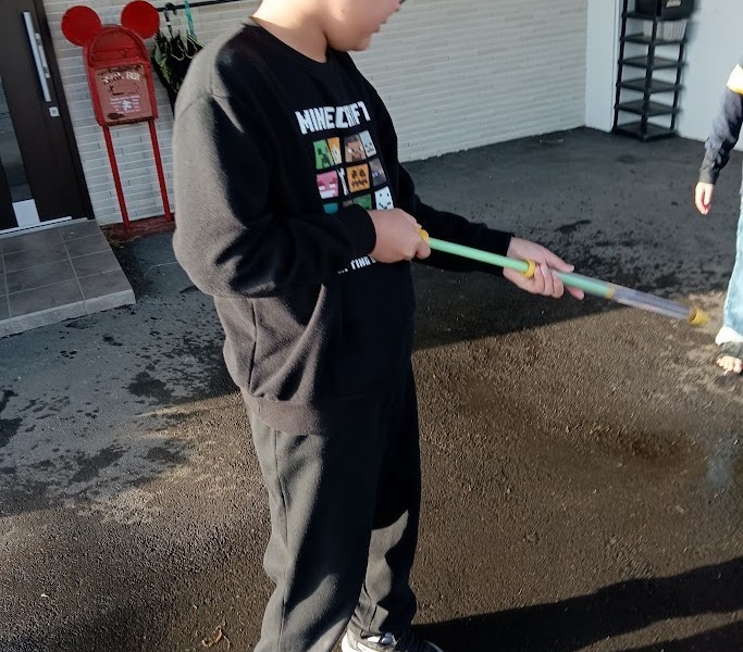 作成。 これは・・・ 輪ゴムでっぽうやねっ♪ いい感じ~👍 の、横では Rさんが 鬼滅の