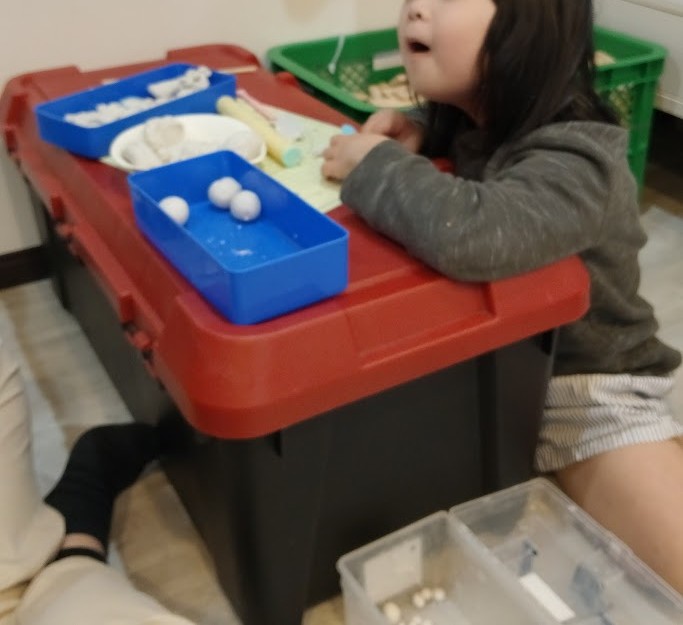 や 粘土あそびが 進行中(=゚ω゚)ノ Rくんは 本格的?な 銃の形を わりばしを 接着して