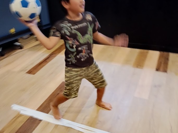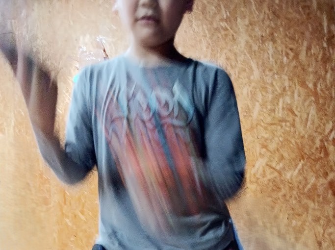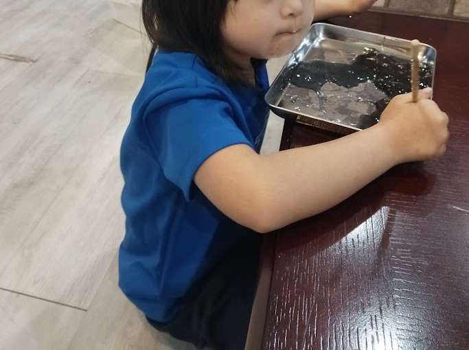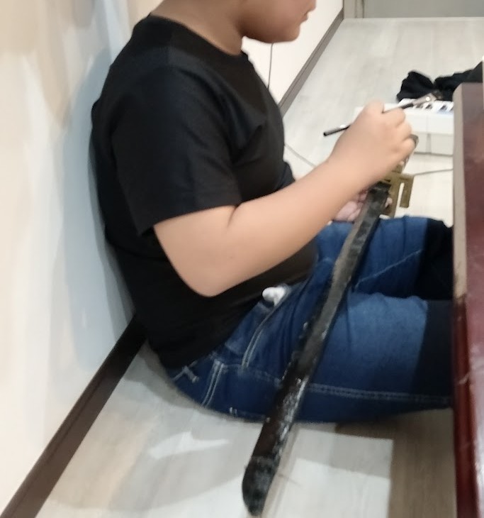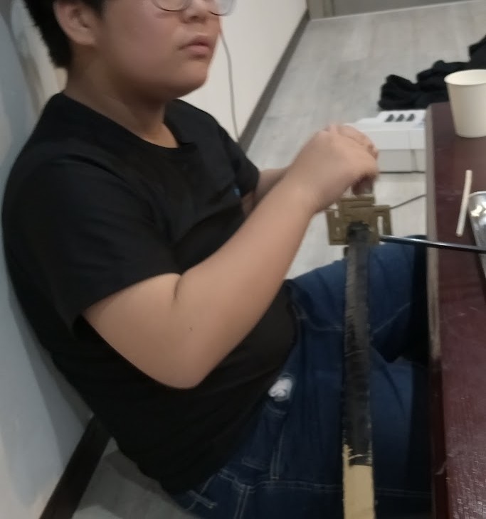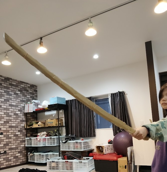 その作業を 横目に Rくんも 先週、 作成した 剣を フリフリ して 感触を 確かめて