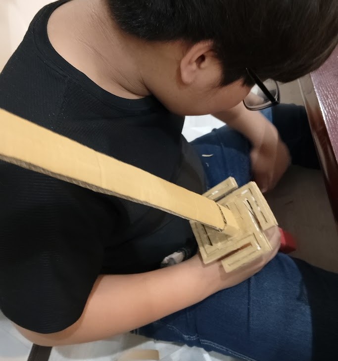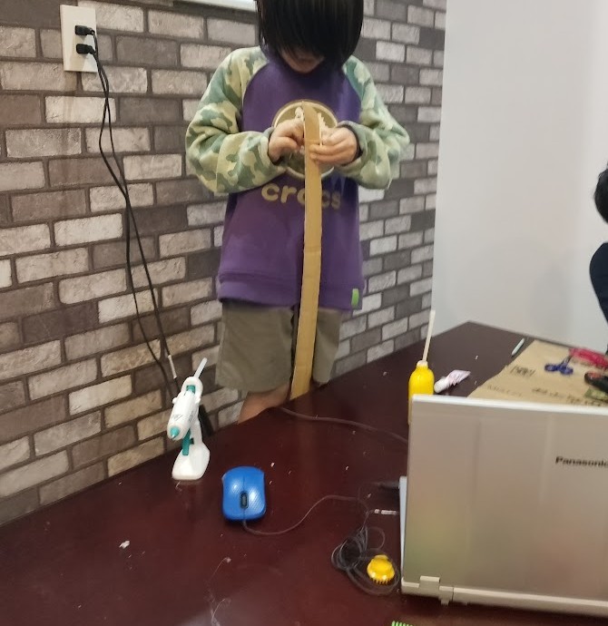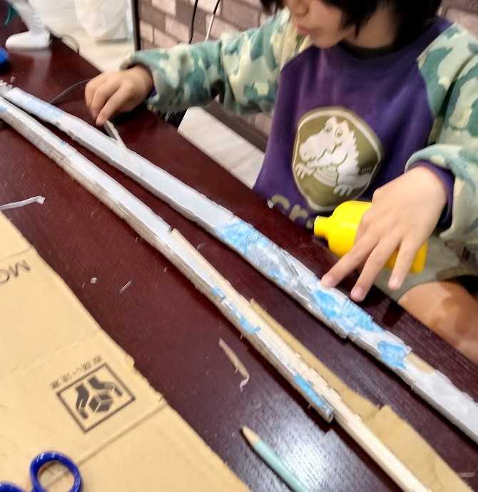 剣の作成に いそしんでいたのは Rさん。 ダンボールを 何枚も 重ね合わせて 太さを