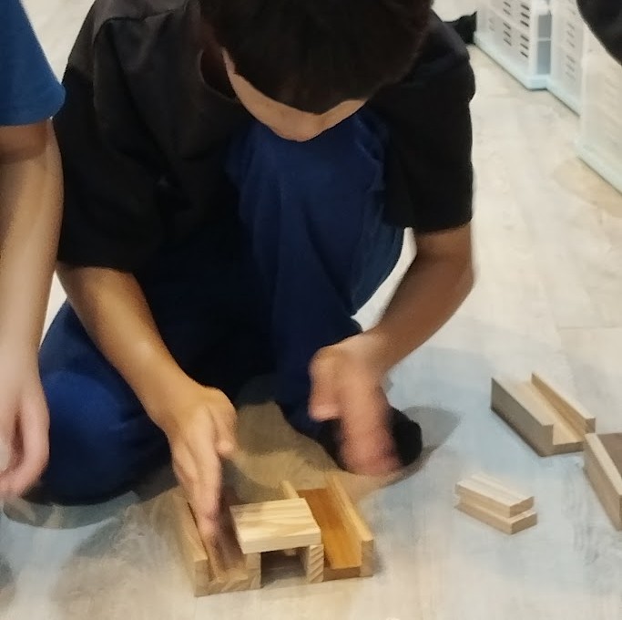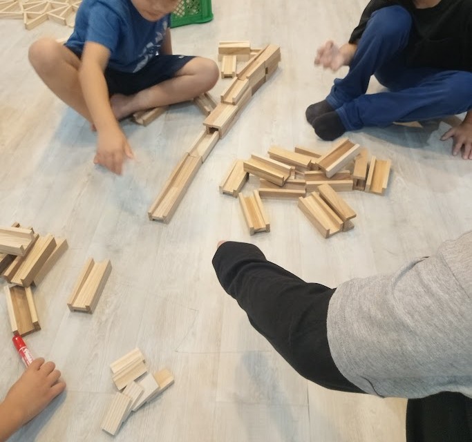 からから・コロカラつみきに いそしんで いる 児童が 数名(^O^)♪ ピタゴラ的なやつ、